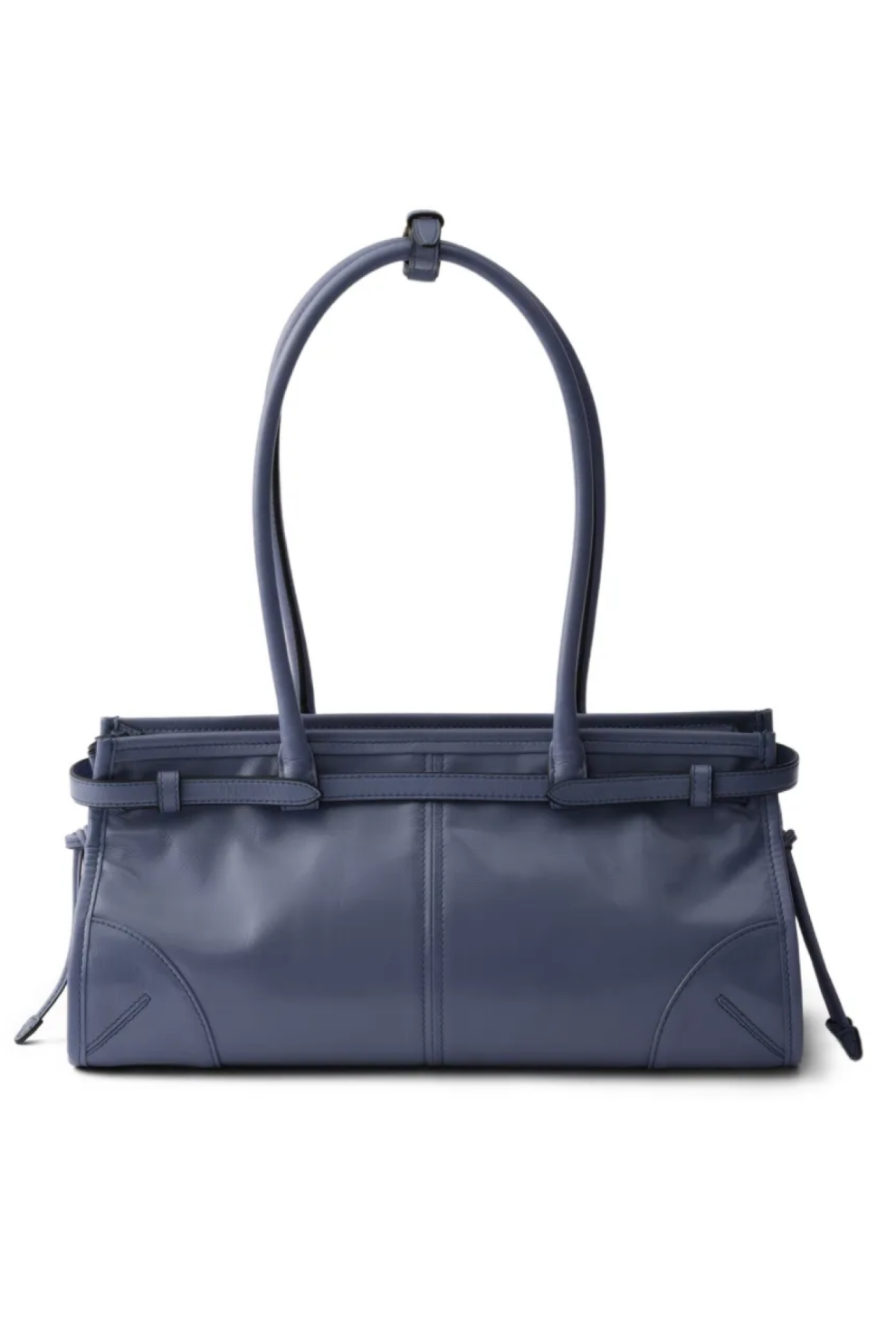 Чёткая прямоугольная форма подчёркивает архитектурный силуэт модели, а две закруглённые верхние ручки обеспечивают комфорт при ношении в руке. Съёмный регулируемый плечевой ремень расширяет стилистические возможности, позволяя носить сумку на плече или через плечо.