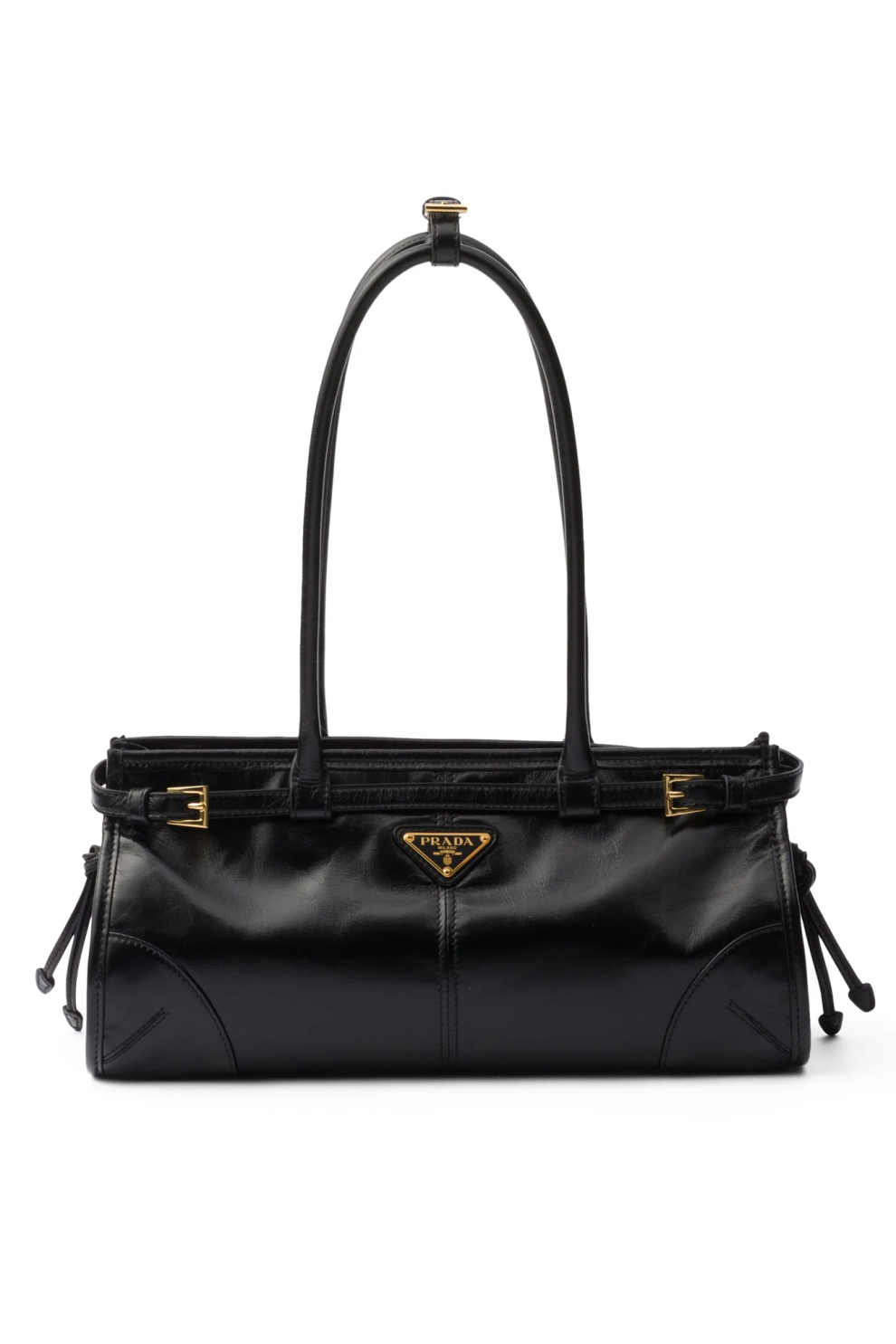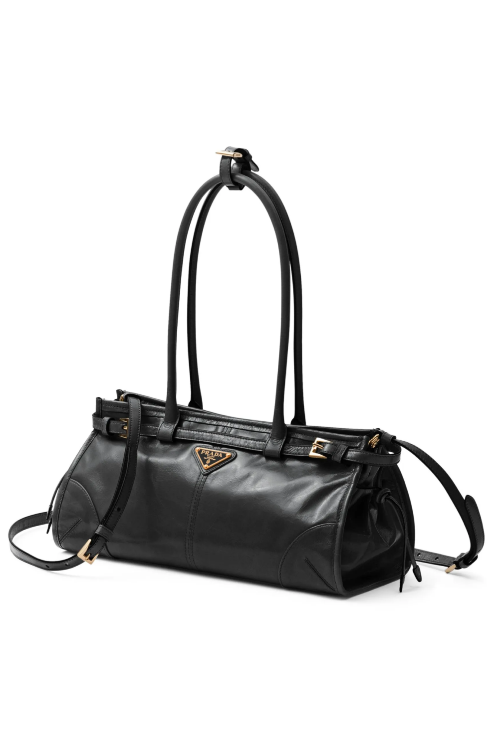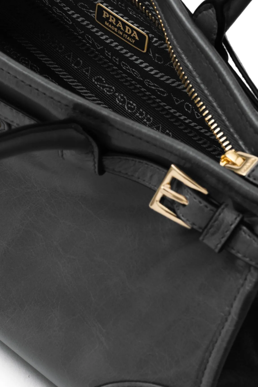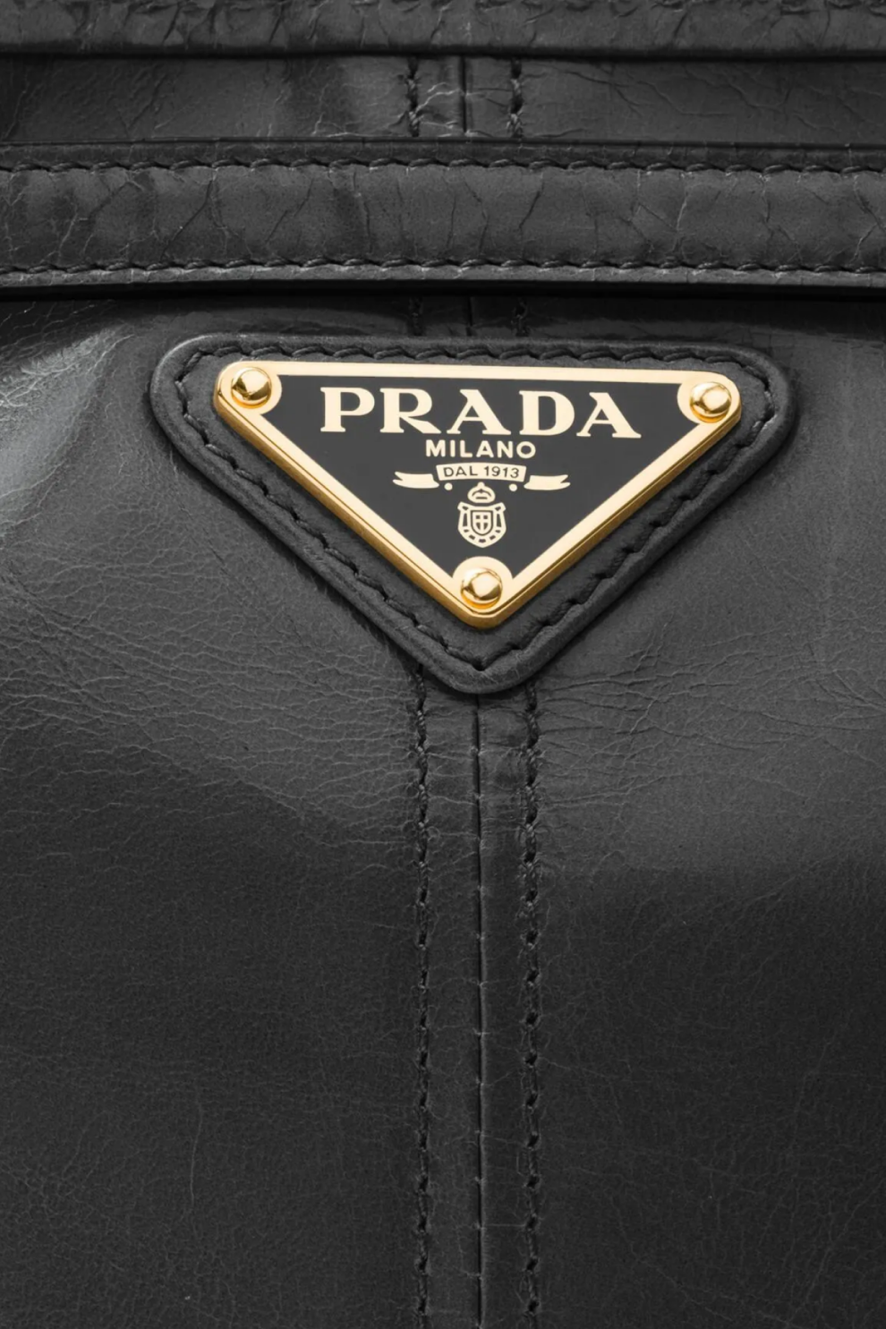 Фирменный акцент — эмалированный треугольный логотип на передней панели — отражает наследие дома Prada, в то время как золотистая фурнитура добавляет образу утончённости. Верхняя застёжка на молнии обеспечивает безопасность, а внутреннее пространство с подкладкой с логотипами, металлическим логотипом и карманом на молнии организует хранение повседневных вещей.