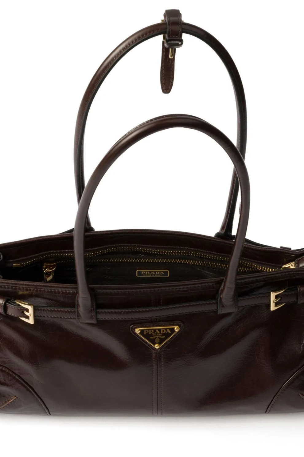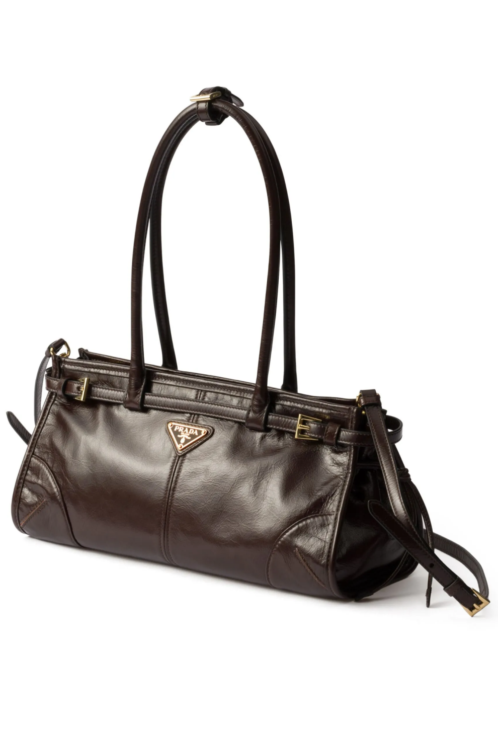 Фирменный акцент — эмалированный треугольный логотип на передней панели — отражает наследие дома Prada, в то время как золотистая фурнитура добавляет образу утончённости. Верхняя застёжка на молнии обеспечивает безопасность, а внутреннее пространство с подкладкой с логотипами, металлическим логотипом и карманом на молнии организует хранение повседневных вещей.
