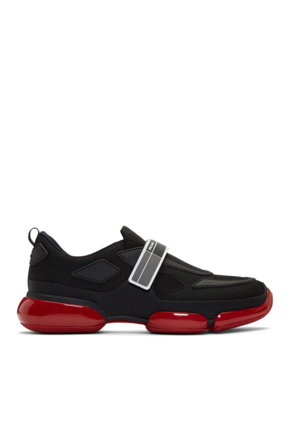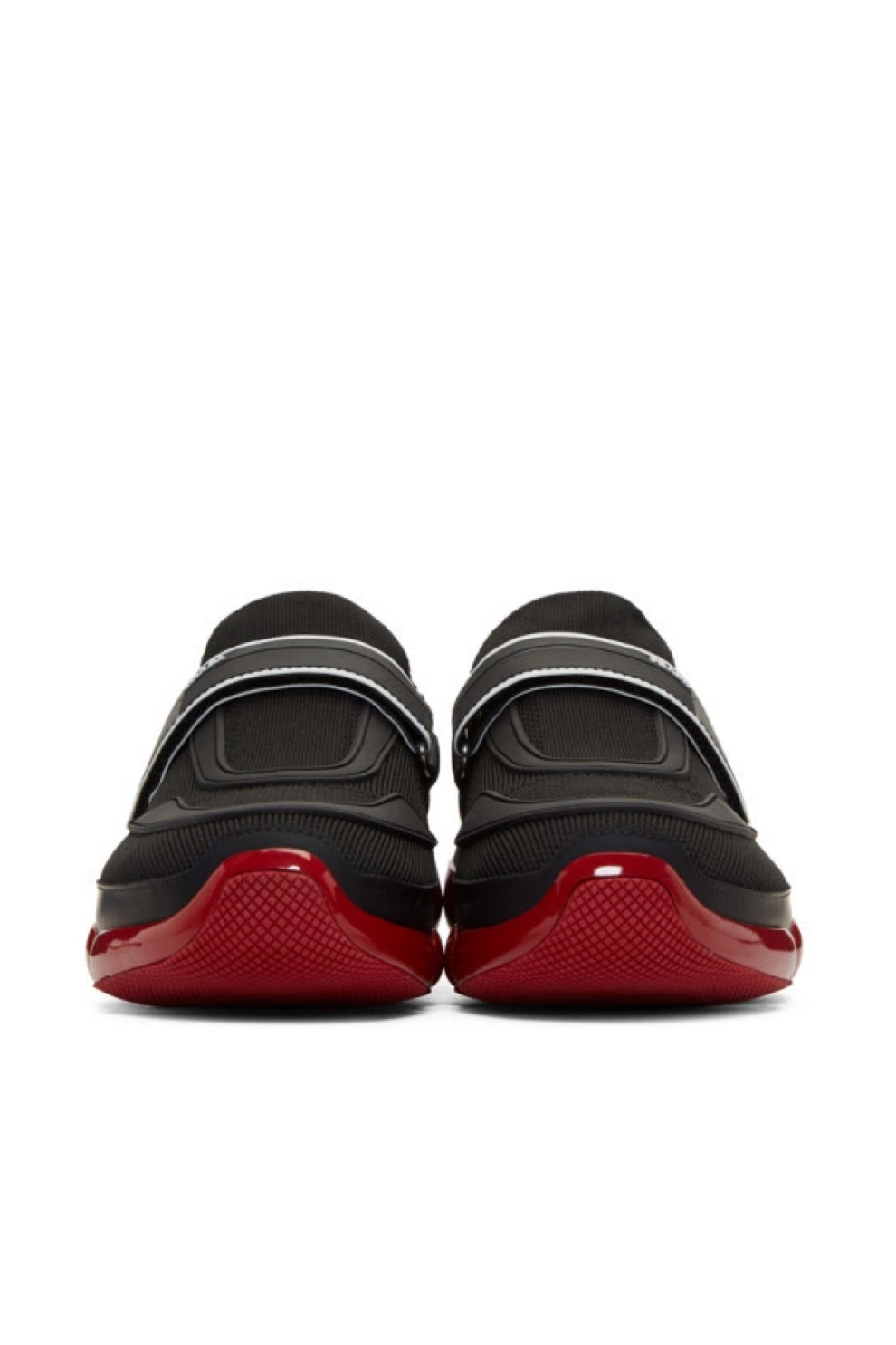 Мужские низкие кеды от Prada, выполненные из трикотажного текстиля и полированной кожи черного цвета с лаконичной резиновой отделкой в тон. Застёжка-липучка с прорезиненным логотипом черного, серого и белого цветов подчёркивает современный графический акцент.