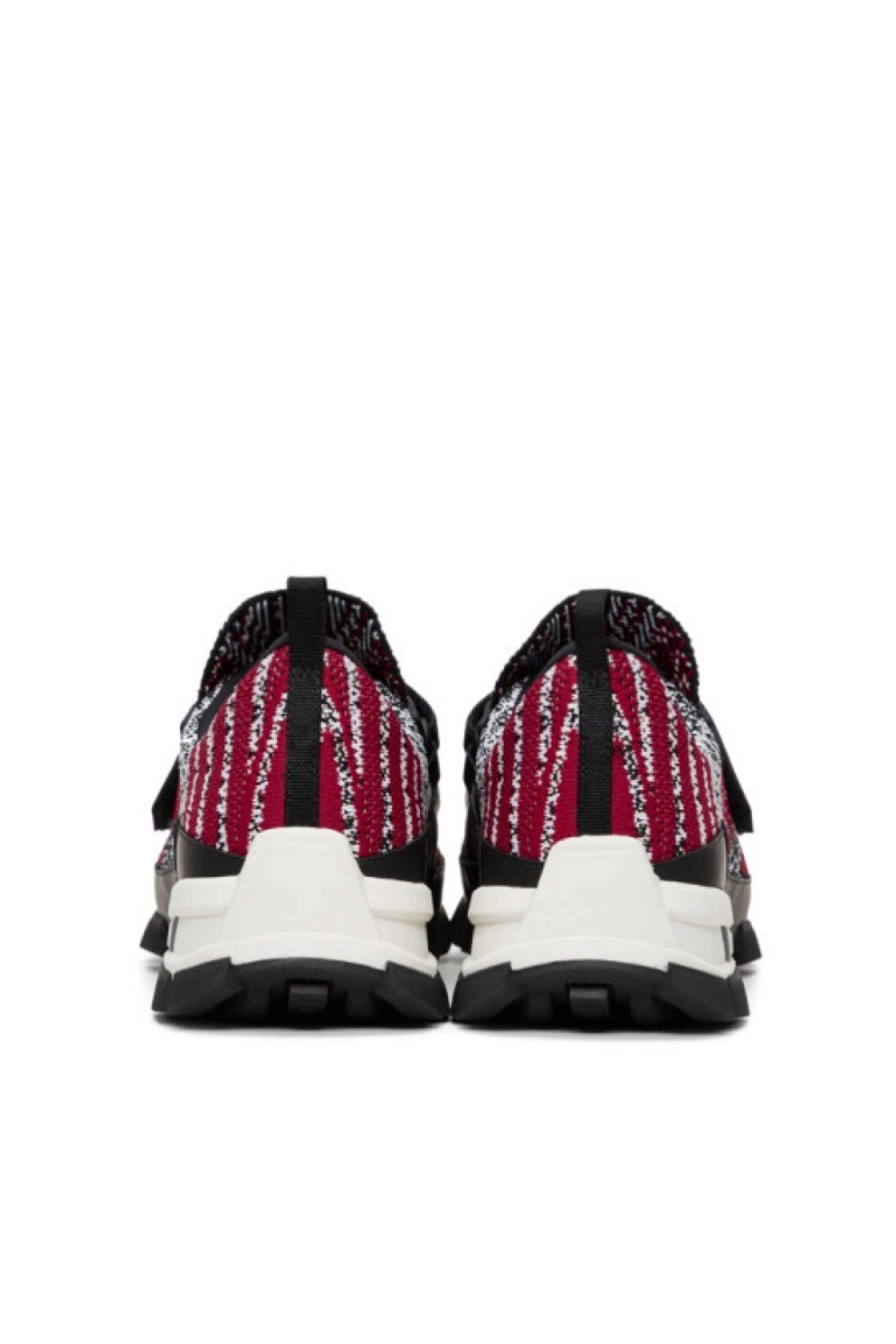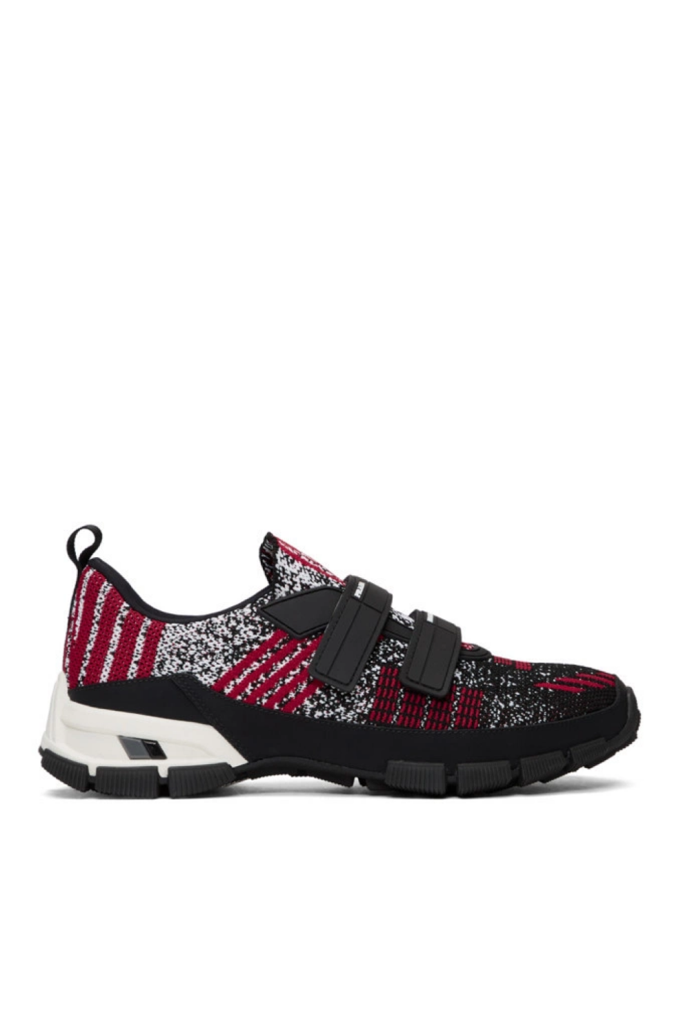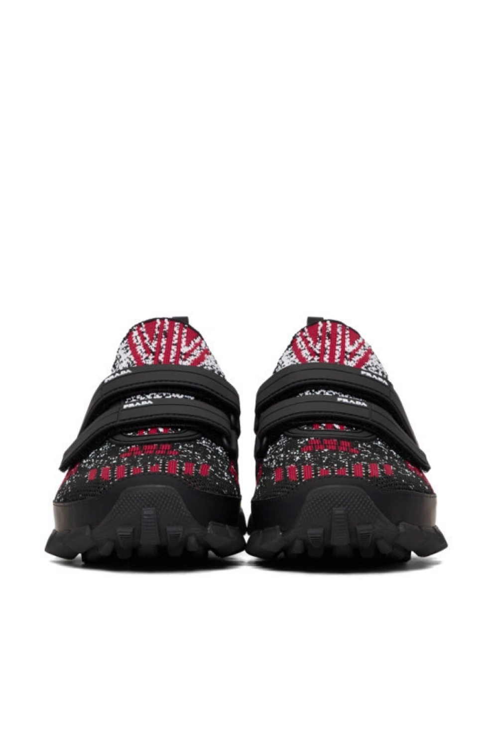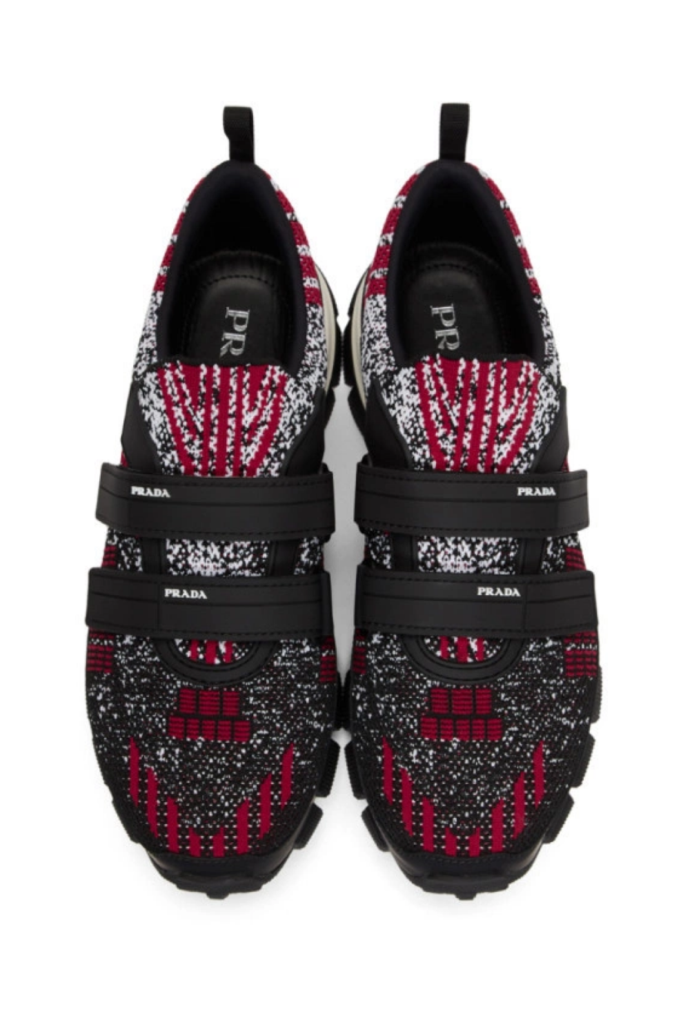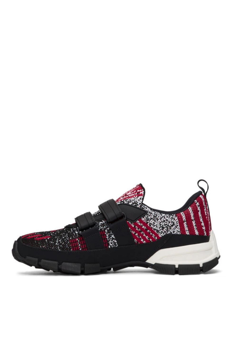 Современные мужские низкие кроссовки от Prada, сочетающие технологичный дизайн и смелую графику. Верх выполнен из вязаного черного материала с белыми акцентами и полосками алого цвета, создавая динамичную текстуру и выразительный визуальный ритм.