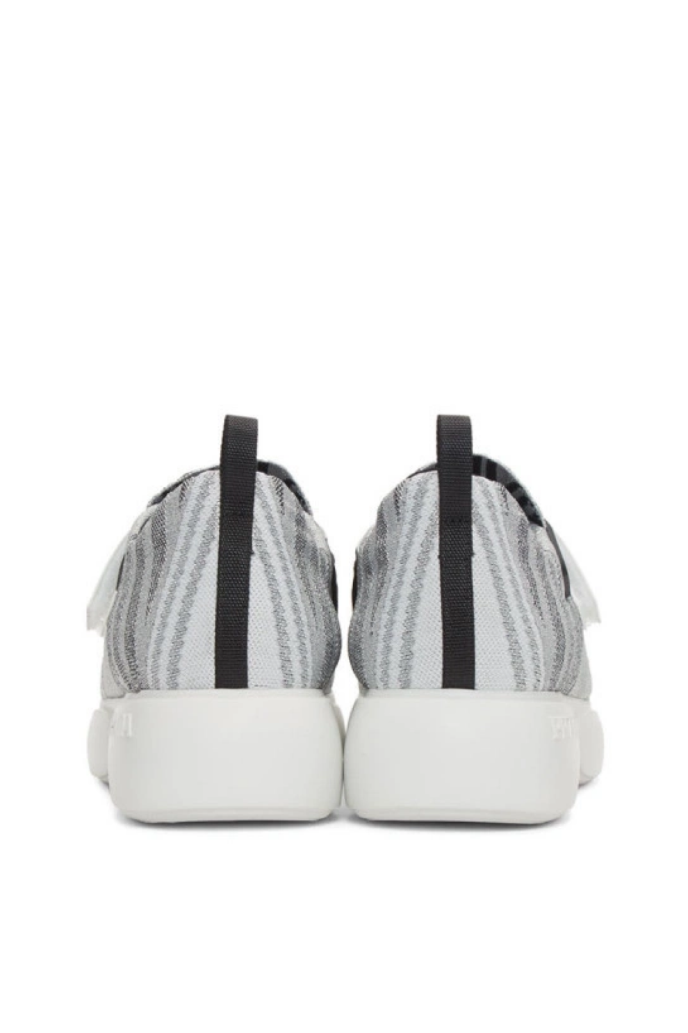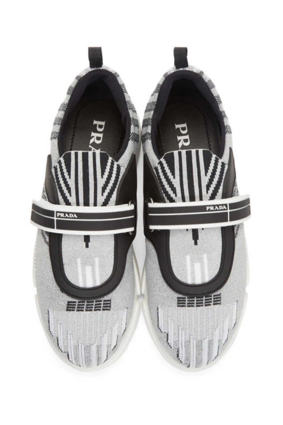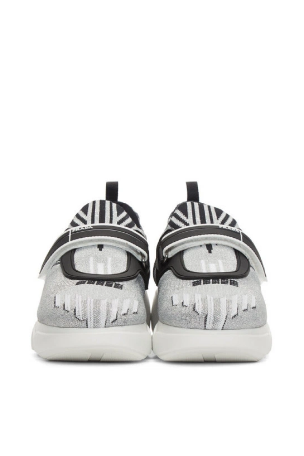 Современные и выразительные кроссовки от Prada, сочетающие инновационные материалы и смелый дизайнерский подход. Модель выполнена из вязаного люрекса серебристого оттенка, который придаёт обуви блеск и футуристический характер, а контрастный чёрно-белый узор по всей поверхности добавляет графичности и текстурной глубины.