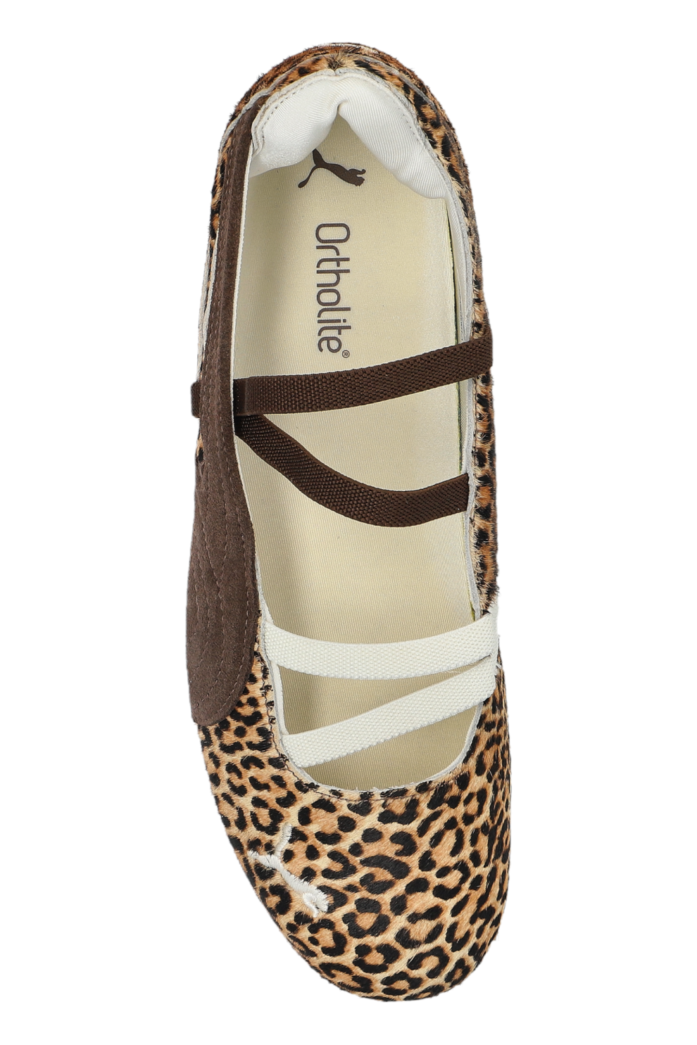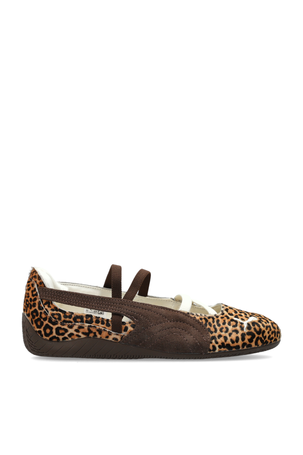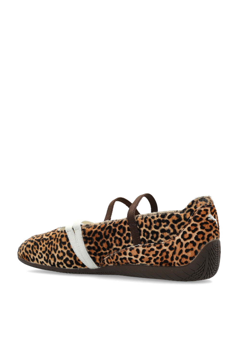 Узкий обтекаемый силуэт подчеркивает изящность линии стопы, а выразительный леопардовый принт, покрывающий большую часть верха, придает обуви смелый и современный характер. Верх выполнен из сочетания мягкой замши и качественного текстиля, что создаёт эффектную игру фактур.