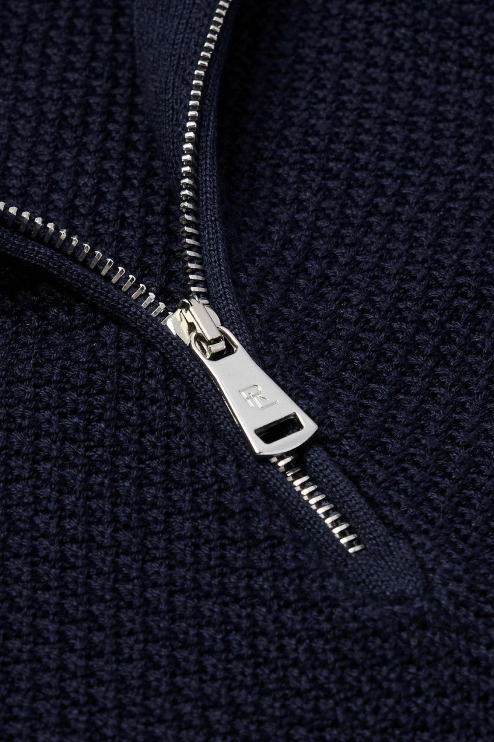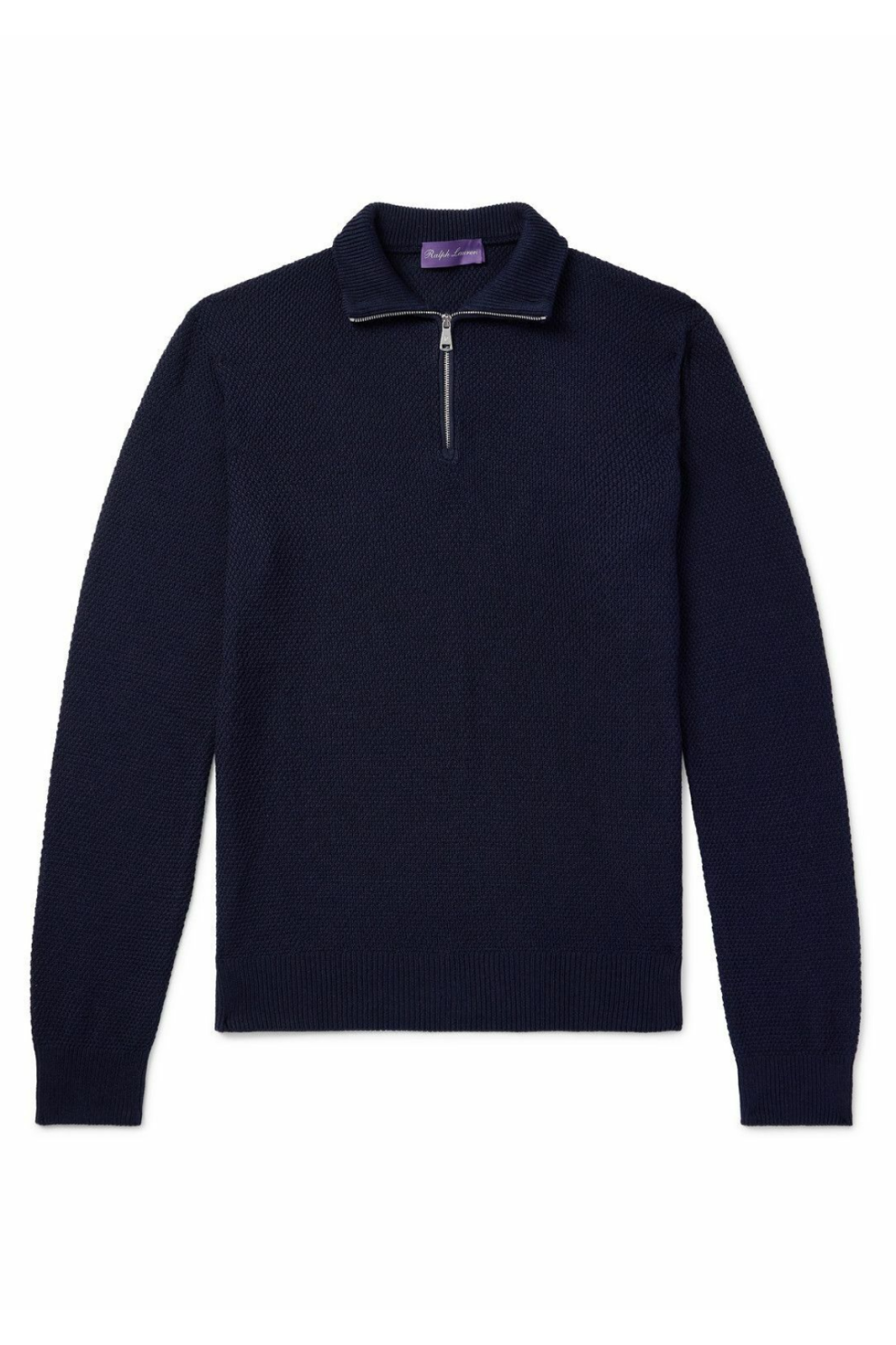 Этот свитер Ralph Lauren Purple Label выполнен из роскошной смеси шелка и хлопка, связанной в элегантную вафельную текстуру, напоминающую ткань пике, что придаёт изделию лёгкий спортивный характер. Половинная застёжка на молнию позволяет носить воротник как стоячим, так и разложенным, создавая стильный и универсальный силуэт.