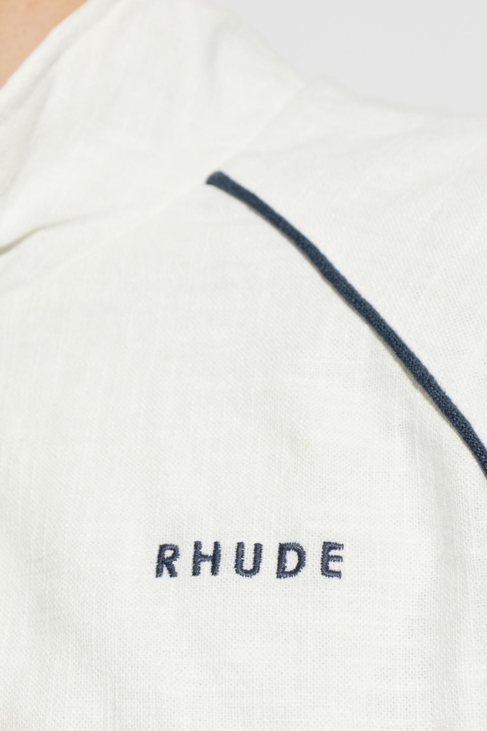 Материал — высококачественный лён с матовой текстурой — обеспечивает воздухопроницаемость и комфорт, а подкладка из лиоцелла придаёт мягкость и ощущение премиального качества. Небольшой вышитый логотип «RHUDE» на груди завершает композицию, оставаясь лаконичным, но узнаваемым акцентом.