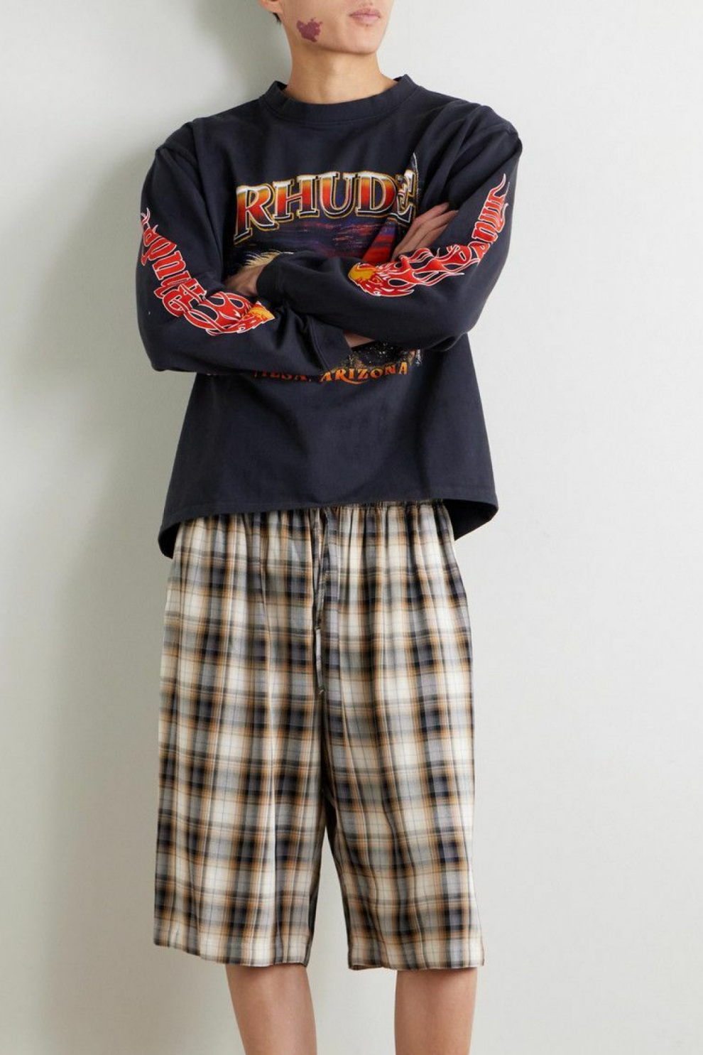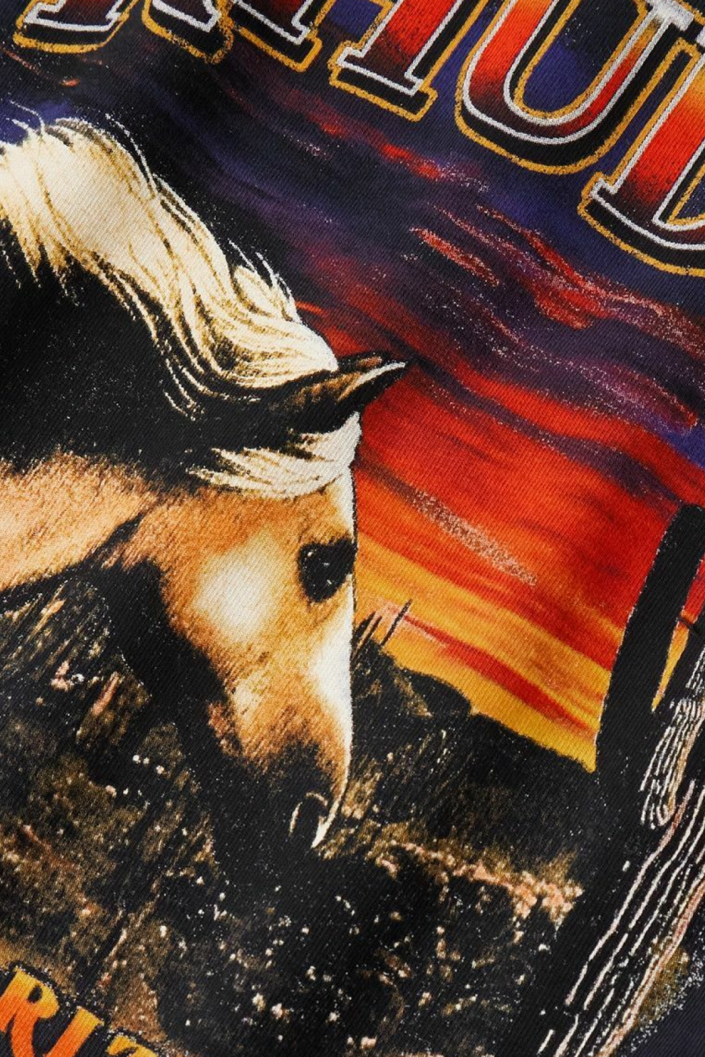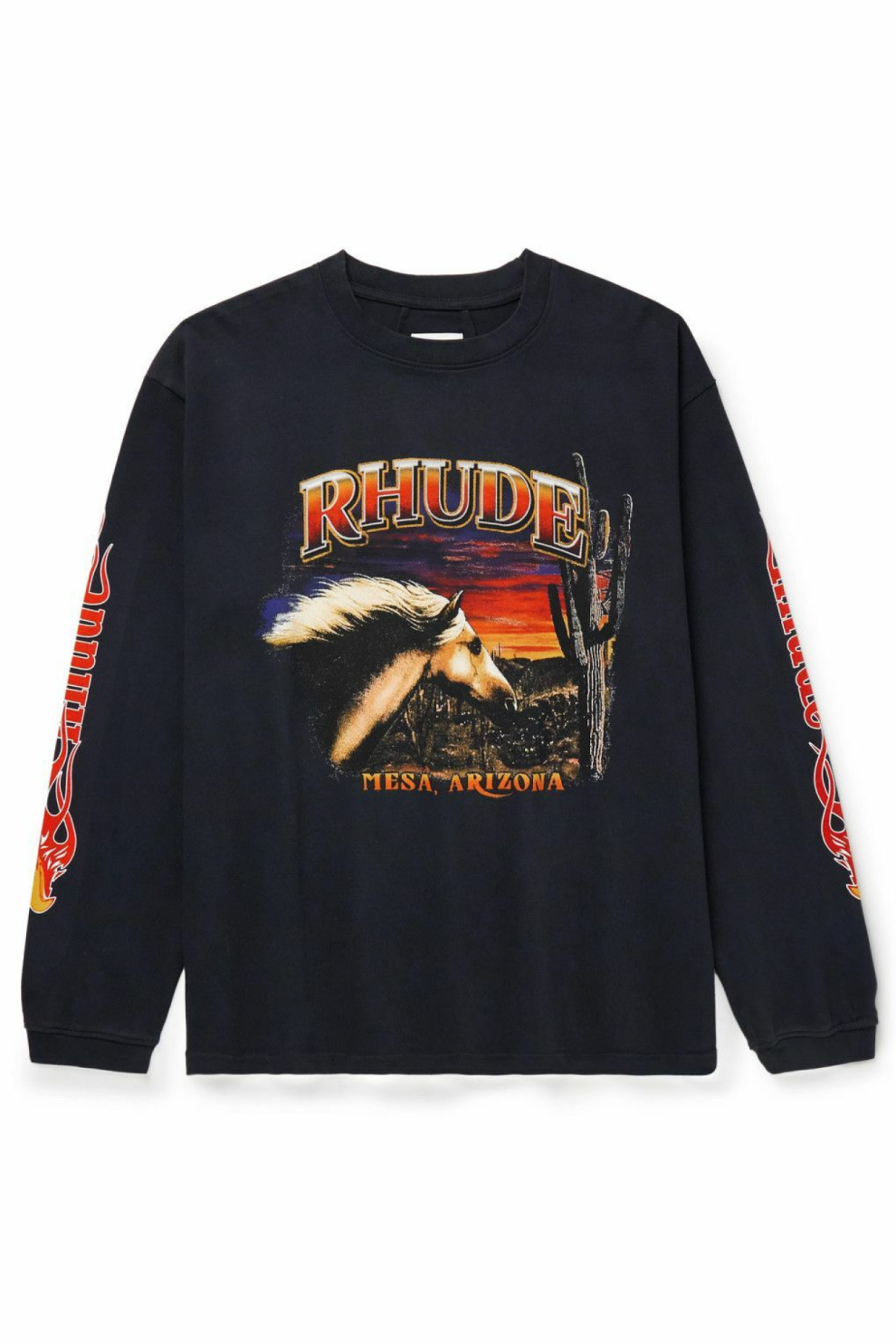 Лонгслив из хлопкового трикотажа Rhude Mesa Stallion в глубоком черном оттенке раскрывает характерную для бренда визуальную поэтику, обращаясь к образам американского Юго-Запада. Графика с пейзажем Месы, штат Аризона, и силуэтом скачущего жеребца наполняет модель ощущением свободы, движения и бескрайних пространств, превращая базовый элемент гардероба в выразительный акцент.