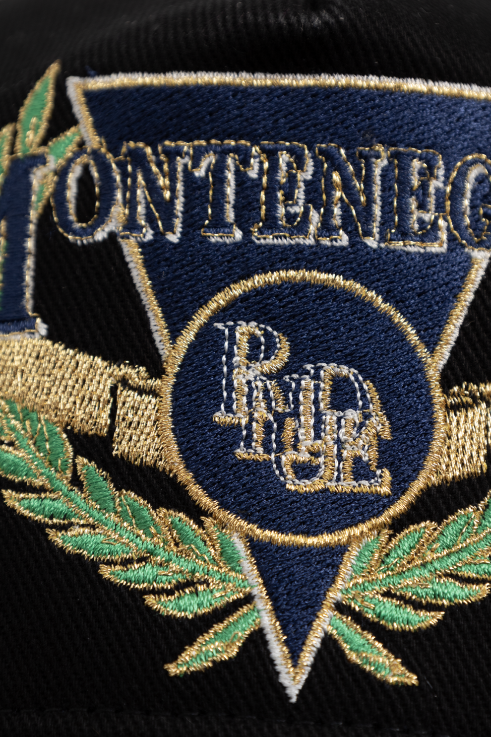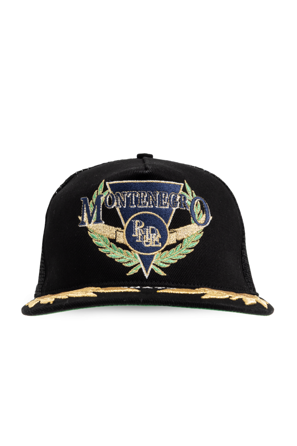 Передняя панель украшена сложной вышивкой в виде треугольного герба, обрамленного лавровым венком в золотых и зеленых оттенках. Надпись MONTENEGRO и деликатная монограмма бренда формируют выразительную композицию, подчеркивая вдохновение морской тематикой и атмосферой регат. Козырек дополнен контрастной вышивкой с лавровыми элементами и надписью REGATTA, усиливая уникальность дизайна и его коллекционную ценность.