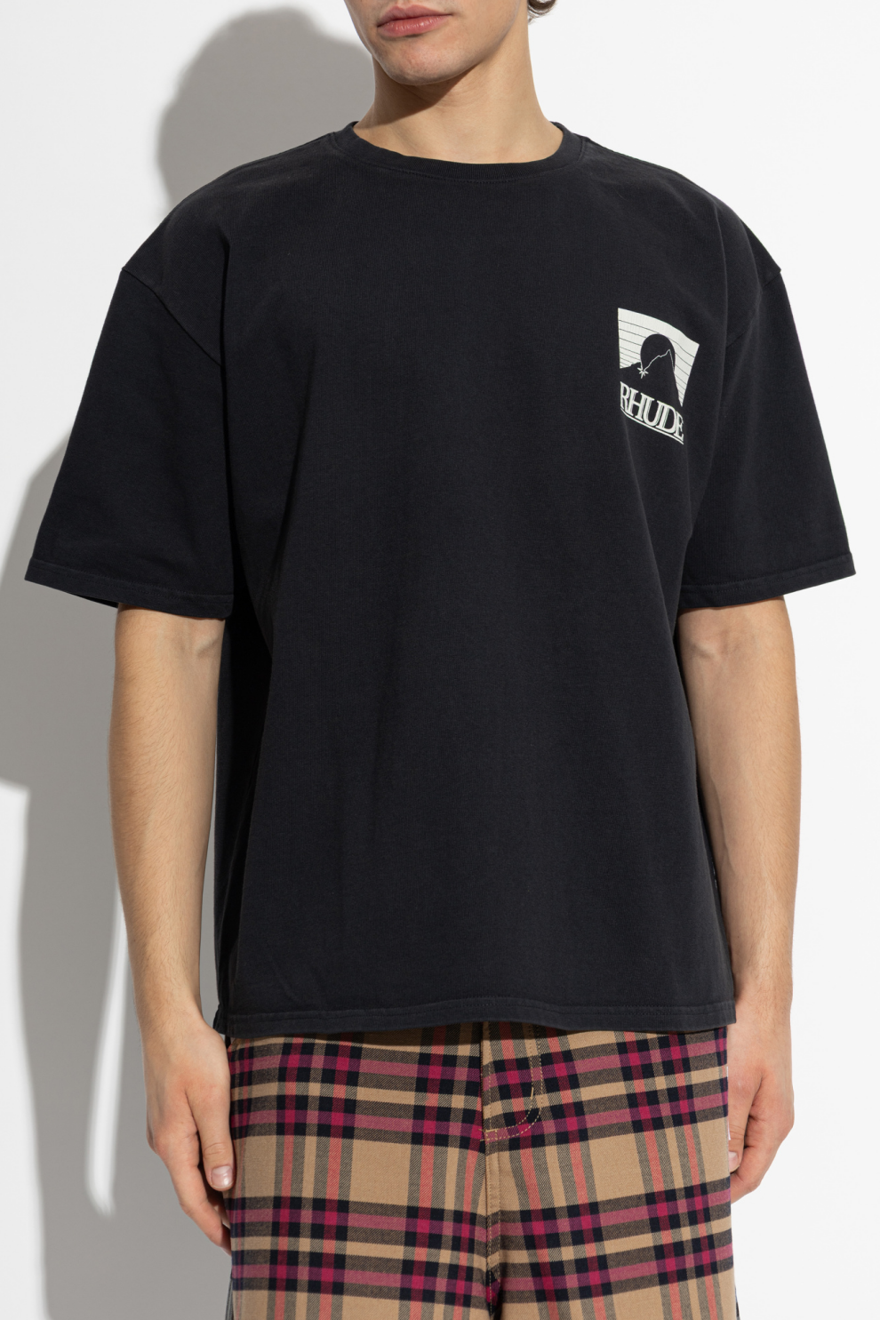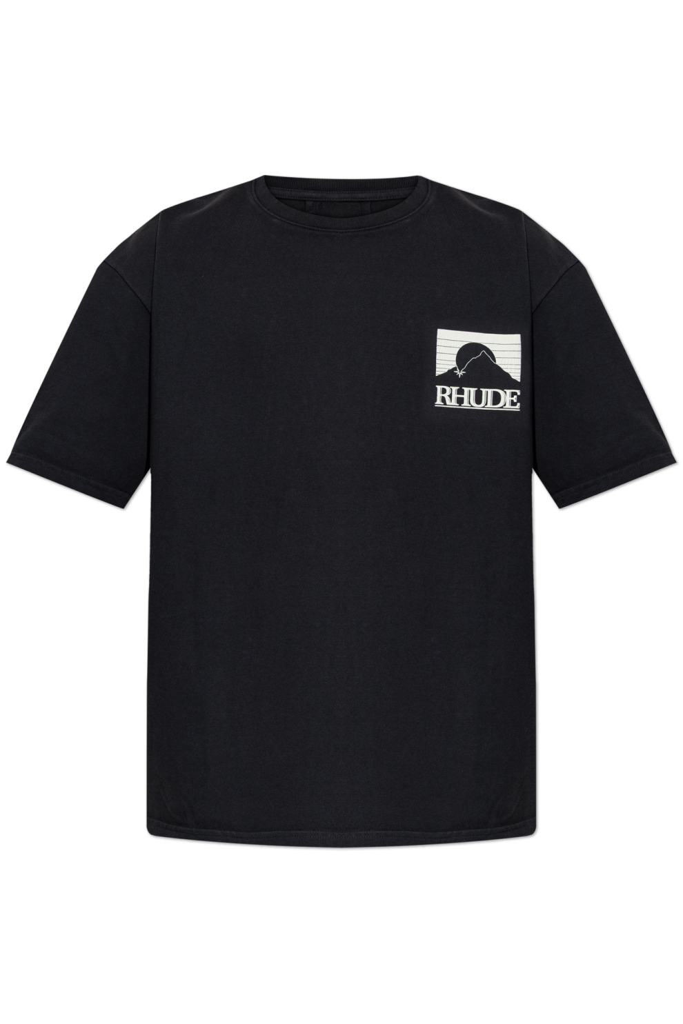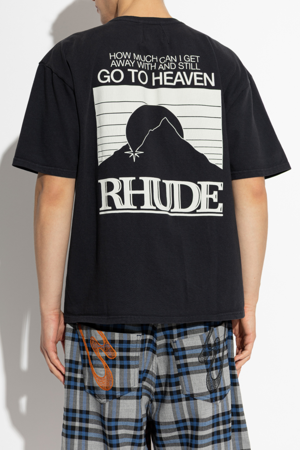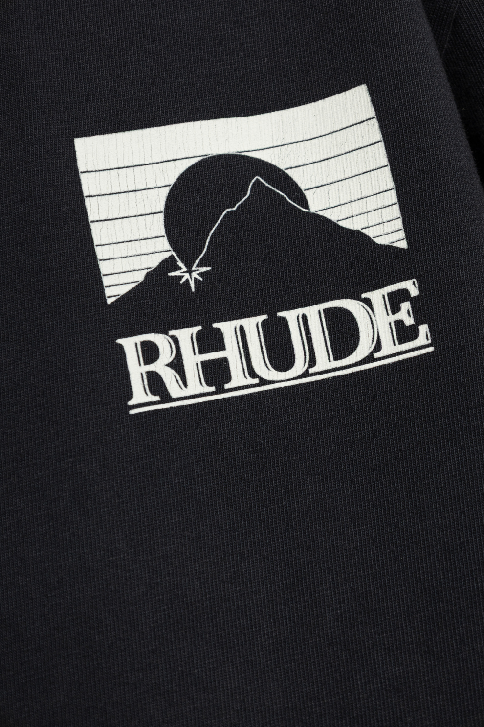Центральным элементом дизайна становится графический принт с мотивом горного пейзажа и заката, который придает модели атмосферность и визуальную глубину. Фирменная надпись «RHUDE» органично вписана в композицию, подчеркивая узнаваемость бренда. На спинке размещено вдохновляющее текстовое сообщение, усиливающее концептуальный характер изделия и добавляющее индивидуальности.