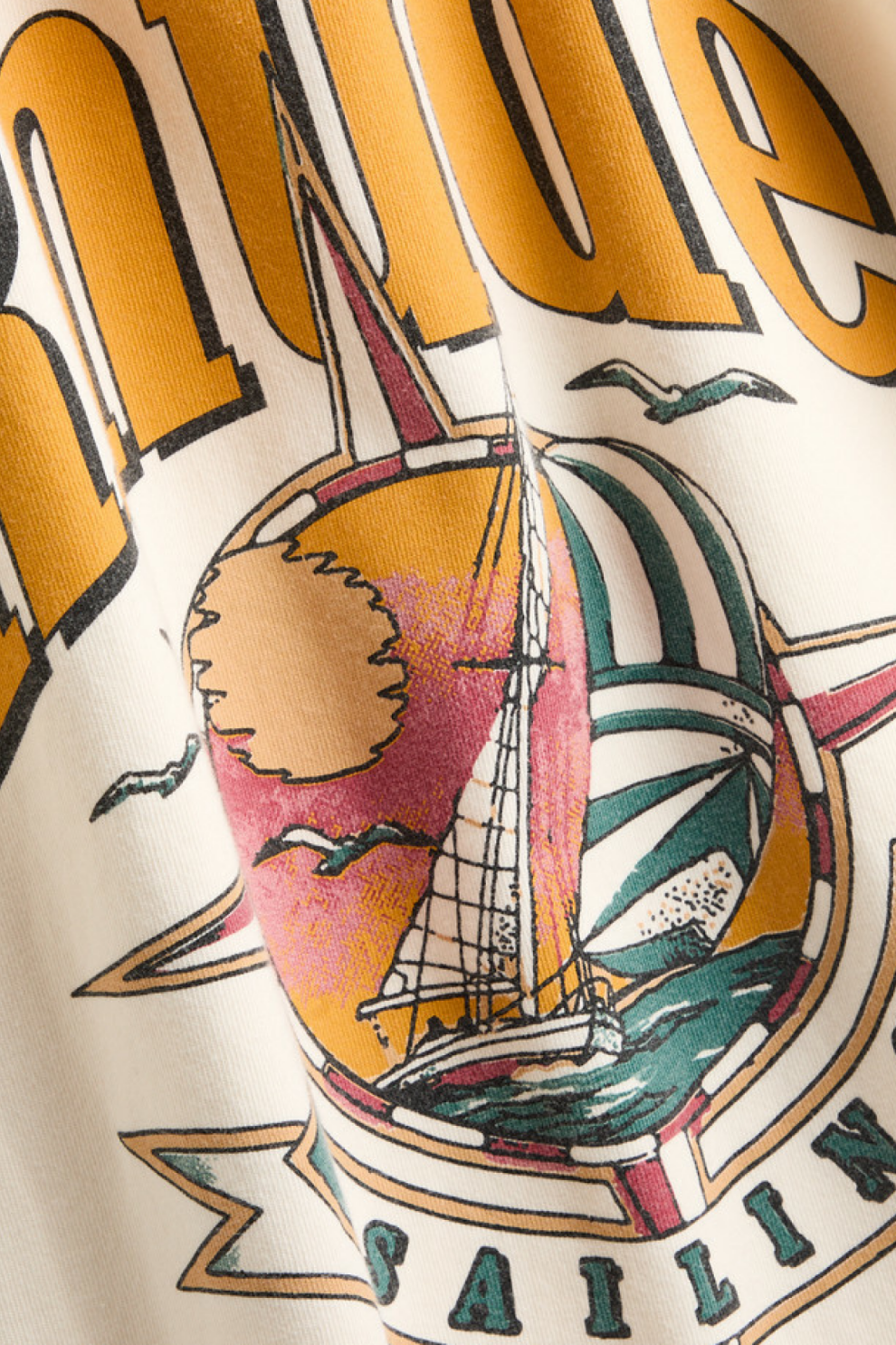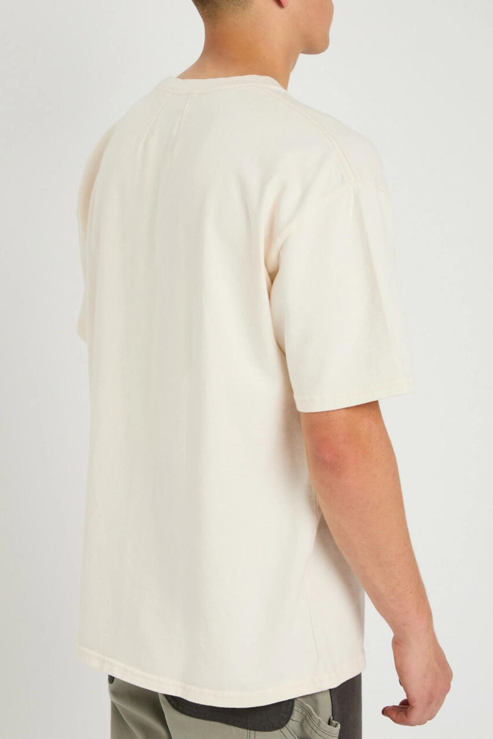 Мягкий хлопок средней плотности формирует комфортное и дышащее полотно, приятное к телу и сохраняющее форму в течение дня. Свободный крой с приспущенной линией плеч создает непринужденный силуэт, соответствующий актуальным тенденциям стритвира, а классический круглый вырез с ребристой отделкой добавляет аккуратную структурность.