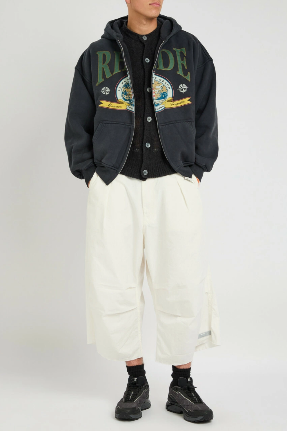 Хлопковая толстовка-худи на молнии Rhude Regatta в глубоком черном цвете отражает характерную для бренда эстетику, где спортивная функциональность переплетается с современным стритвиром и выразительной графикой. Принт на передней части задает образу динамичное настроение, отсылая к теме движения и свободного пространства, сохраняя при этом лаконичную визуальную строгость.