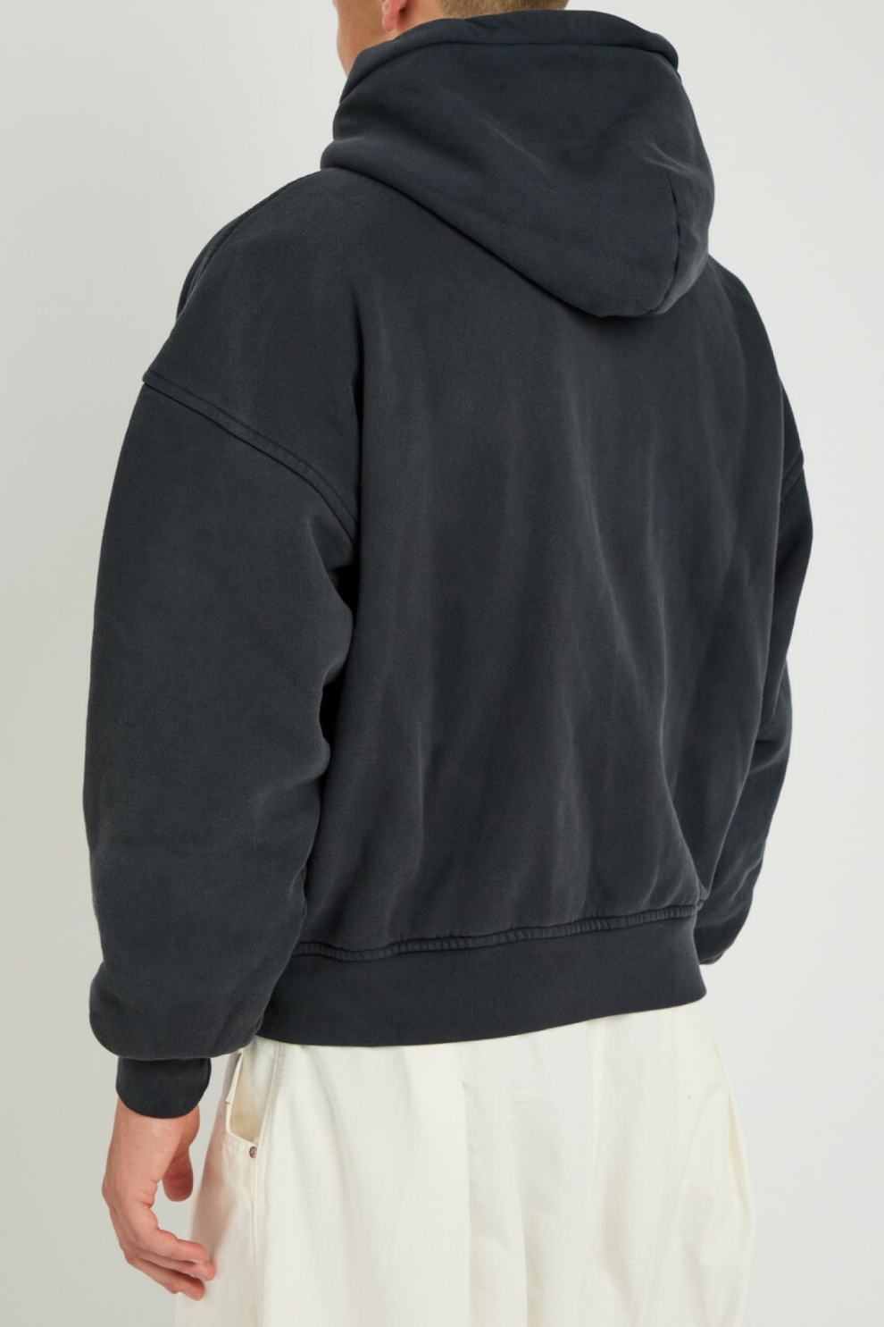 Двусторонняя молния спереди позволяет варьировать стилизацию, делая худи более универсальным элементом гардероба, а накладной карман добавляет функциональный акцент. Ребристая отделка завершает конструкцию, аккуратно фиксируя форму и подчеркивая продуманность деталей.