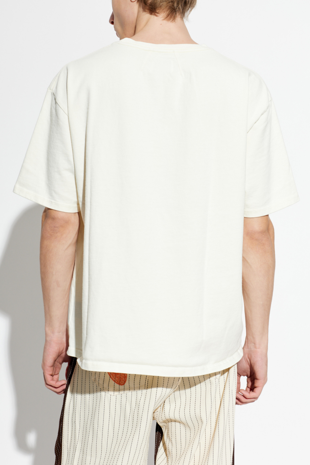 Эта кремовая футболка с принтом от Rhude — изысканное сочетание дизайнерского мастерства и нетрадиционного стиля. Ее слегка свободный классический крой с круглым вырезом и прямым низом ненавязчиво подчеркивает непринужденный, повседневный стиль владелицы.