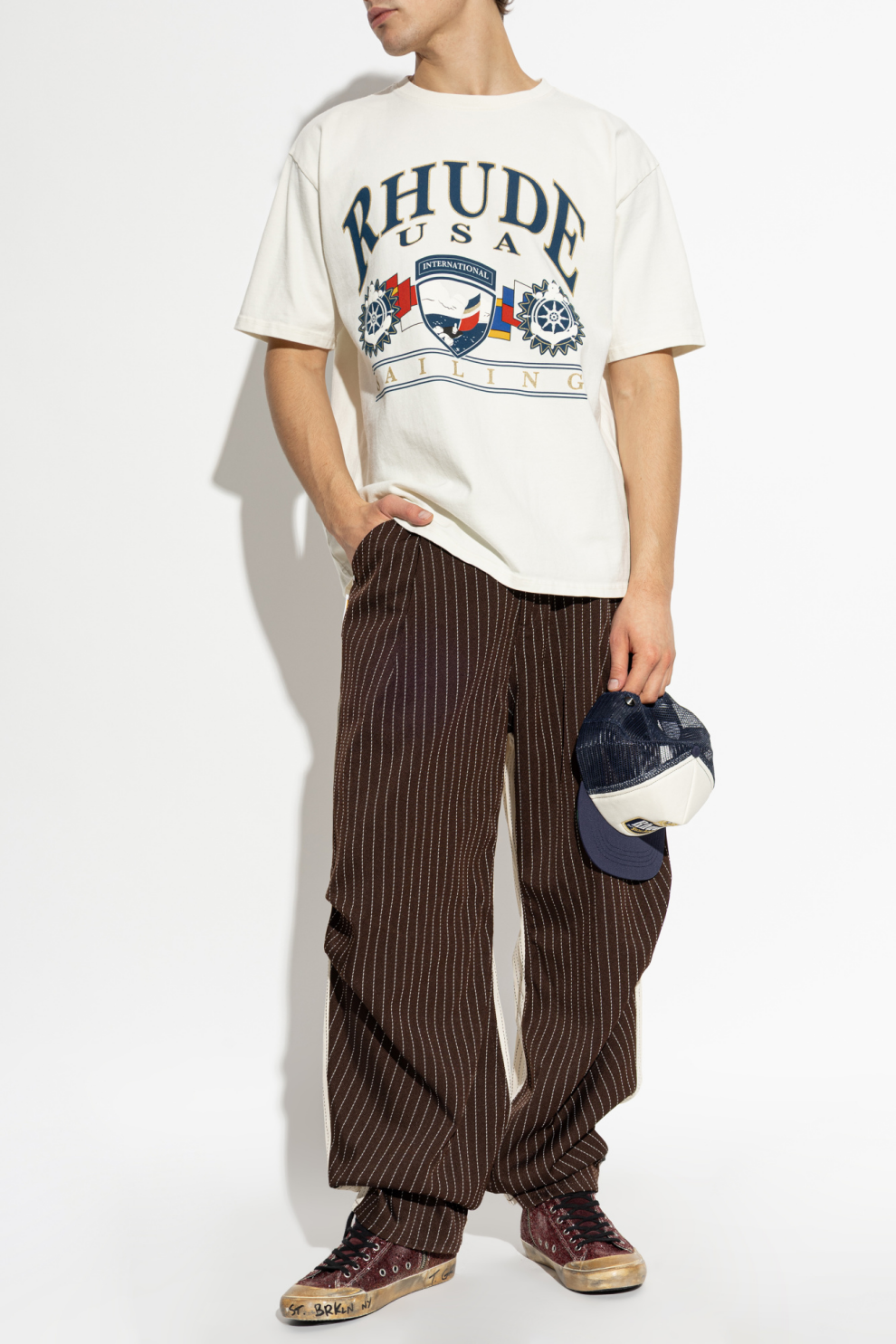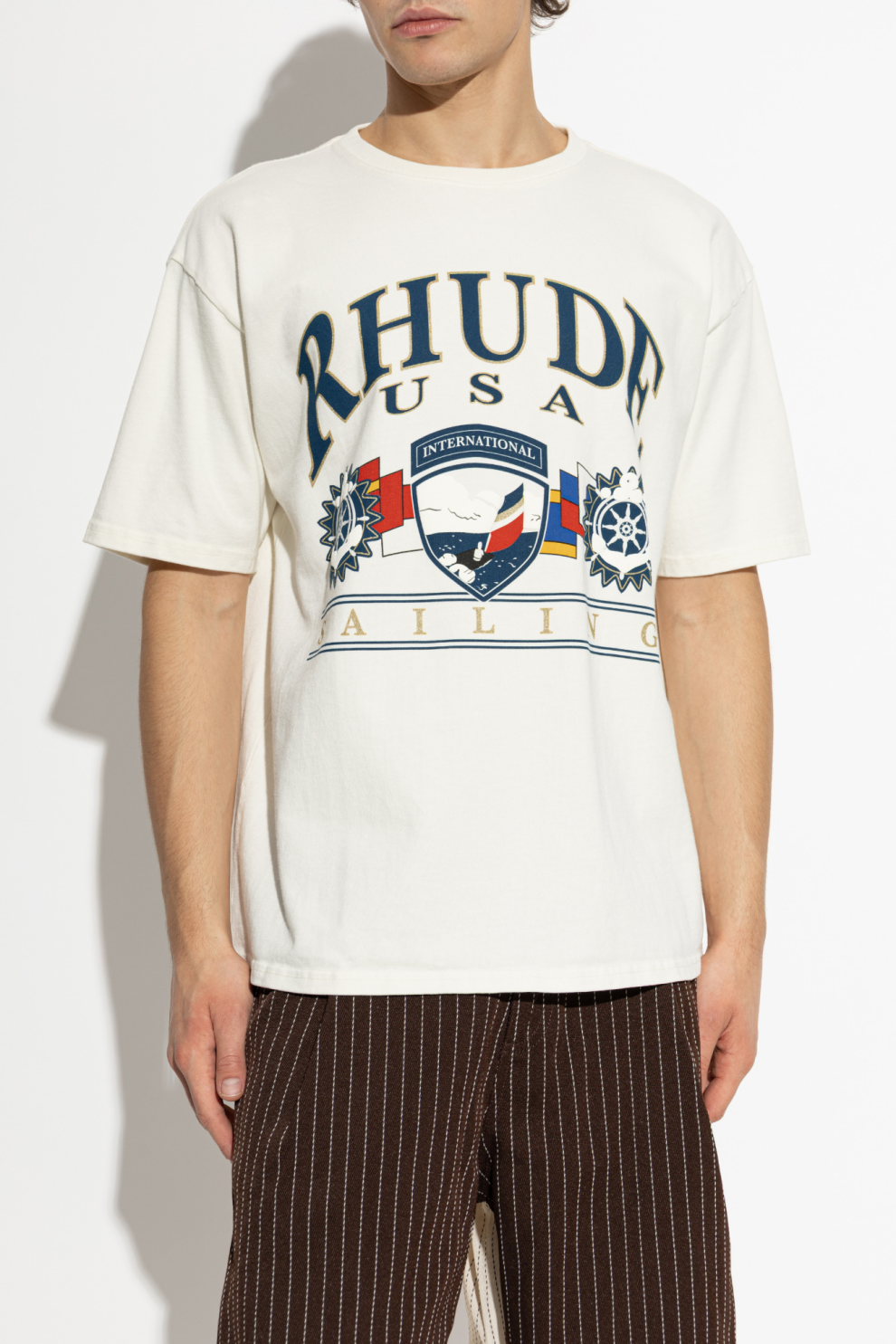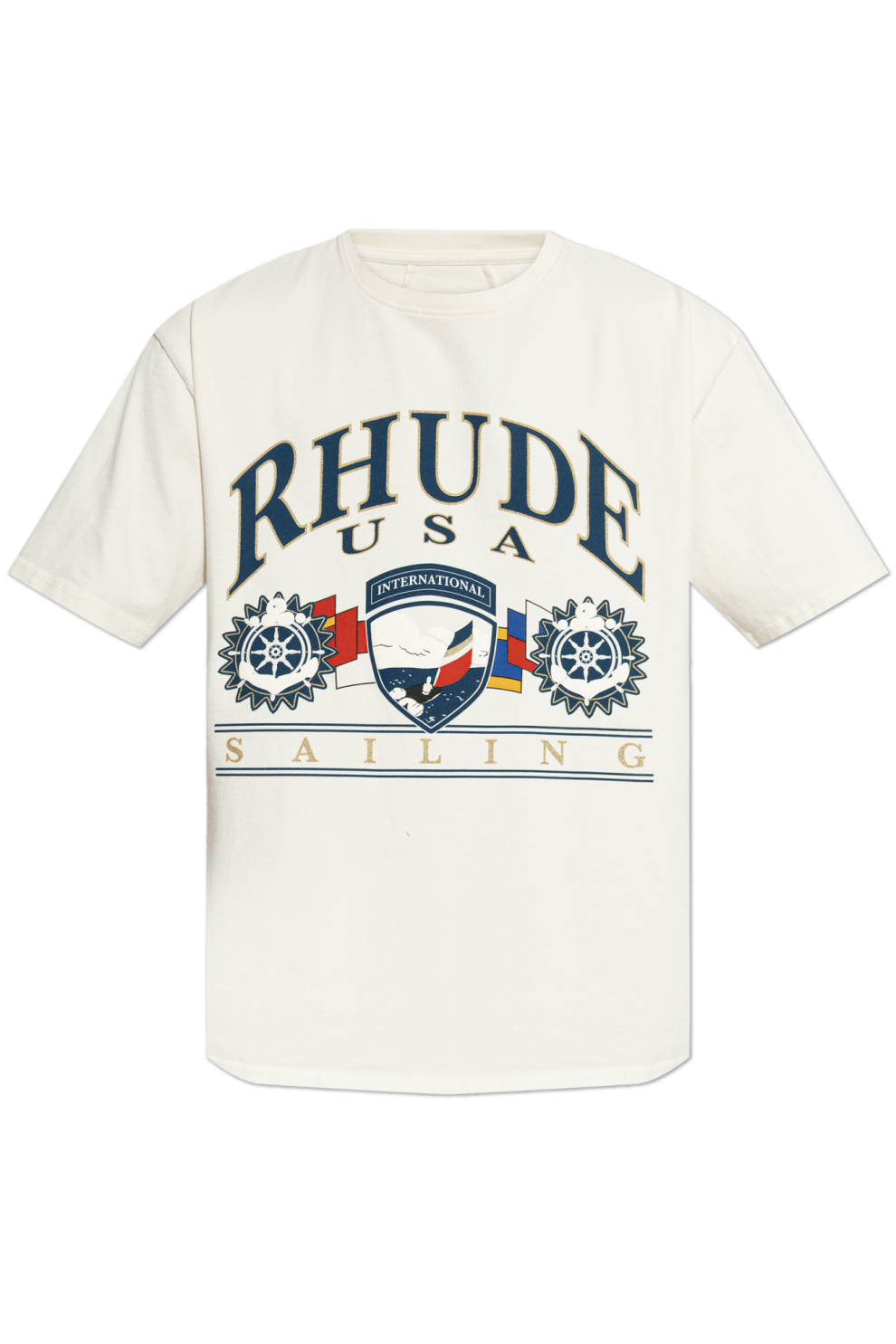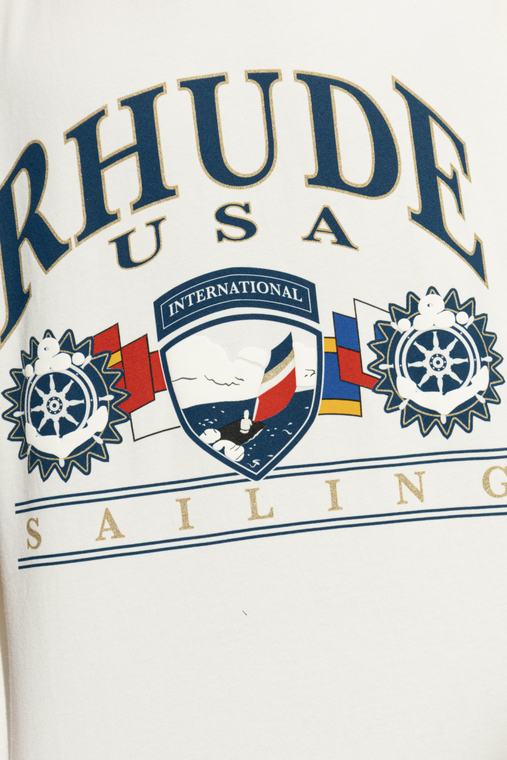 Центральным элементом дизайна становится сложный принт на передней части: крупная надпись «RHUDE USA» сочетается с декоративным гербом, морской символикой и надписью INTERNATIONAL. Мотивы парусника, штурвала и сигнальных флагов формируют цельную композицию, вдохновленную эстетикой регат и путешествий, придавая изделию характер и глубину.