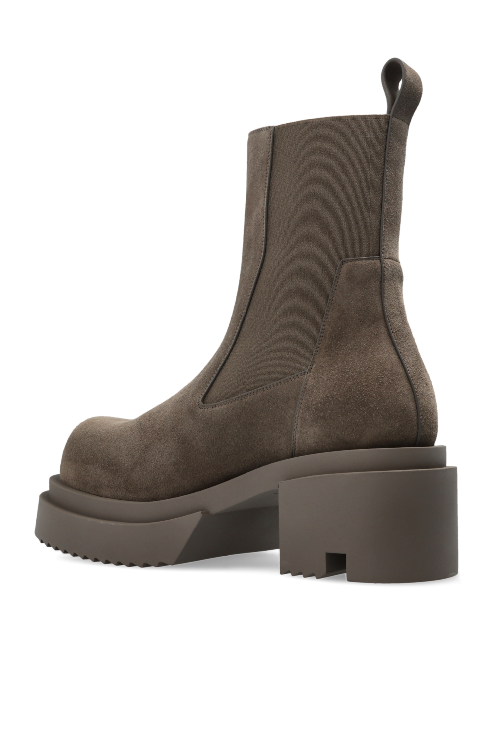 Коллекции обуви Rick Owens переосмысливают культовые силуэты сквозь призму своей готической, искажённой эстетики, создавая модели, которые точно отражают преувеличенные пропорции коллекций. Beatle Bogun — один из таких примеров: традиционные челси преображаются благодаря фирменной платформе Mega Creeper, увеличенному выпуклому носку и угловатым резинкам по бокам.