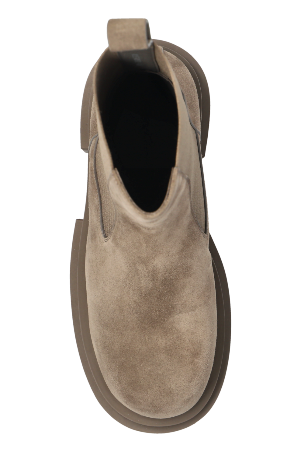 Минималистичный дизайн без лишних украшений в серо-бежевом цвете позволяет в полной мере оценить прочную конструкцию, закруглённый носок и современную массивную платформу. Высокий, лаконичный верх из нубука с матовой, состаренной отделкой подчёркивает уникальность бренда.