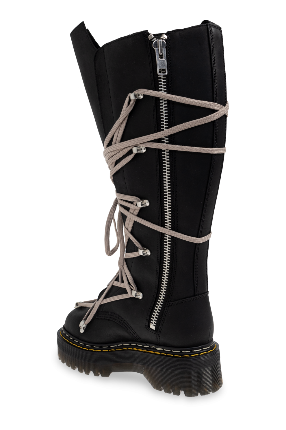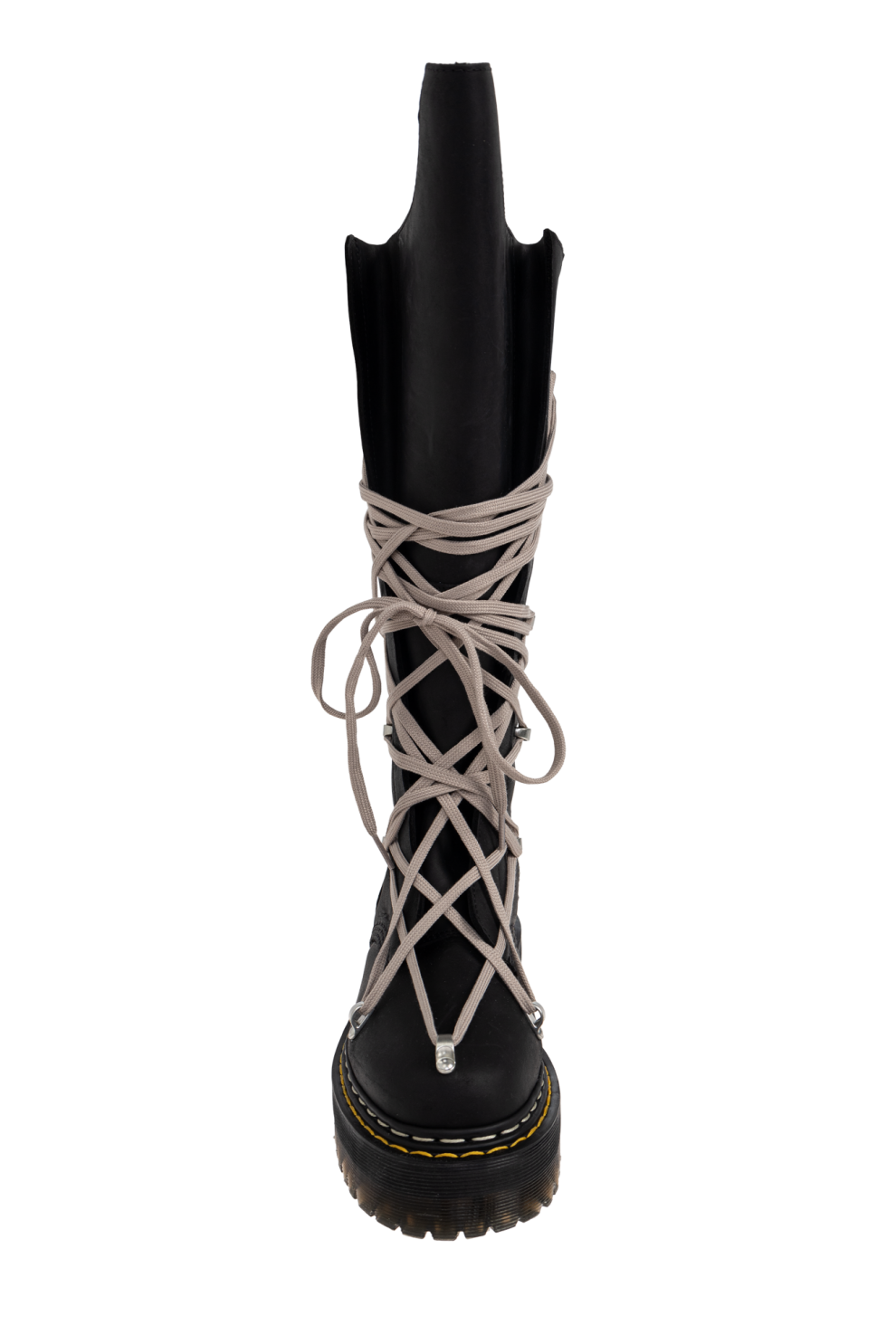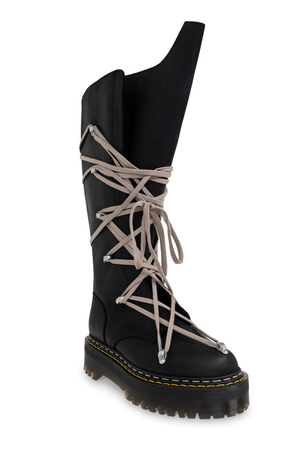 Высокие женские ботинки Rick Owens DRKSHDW x DR MARTENS SEA – образец современного авангардного мастерства. Эти уникальные сапоги по колено завораживают своим эффектным чёрным верхом с неровной асимметричной отделкой. Туфли украшены эффектными длинными светло-серыми шнурками, неравномерно обмотанными и продетыми в металлические люверсы, что создаёт интригующий диссонанс.