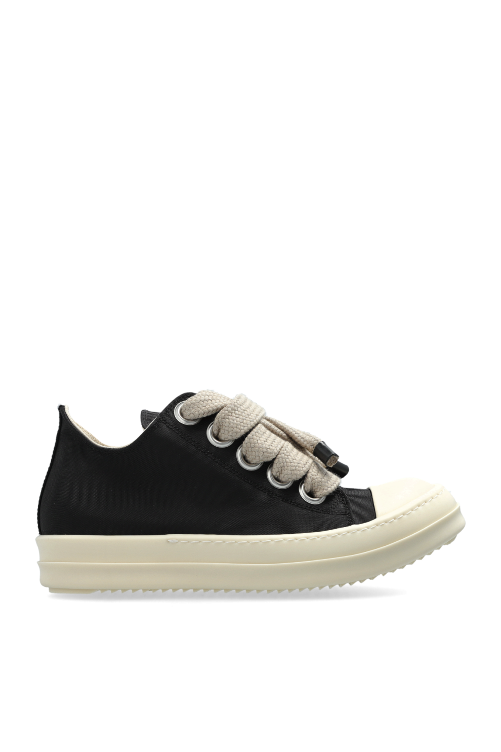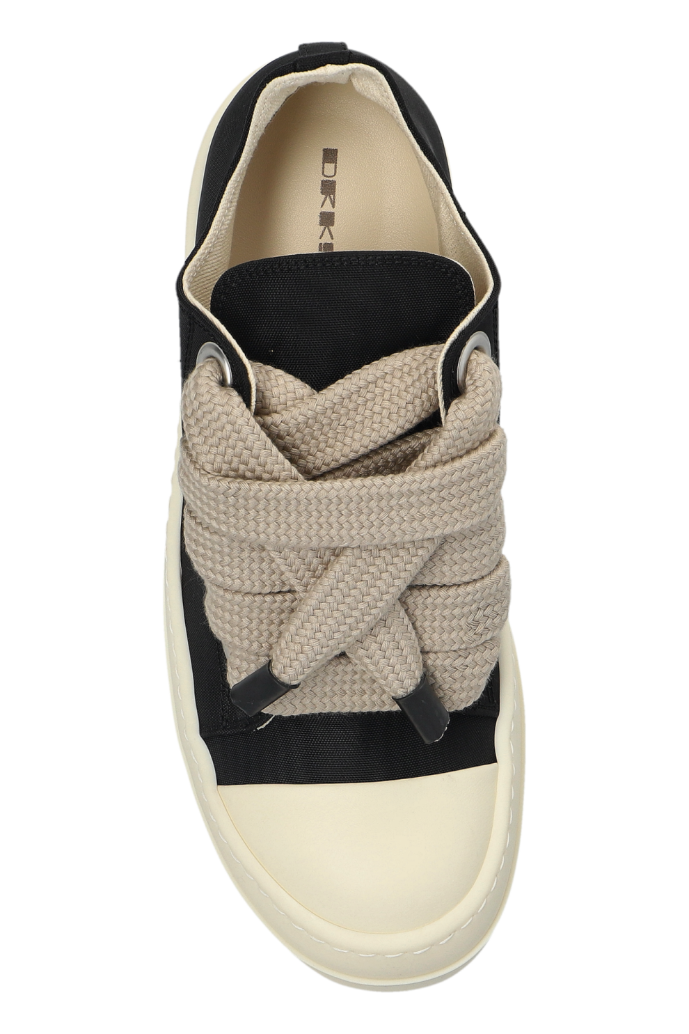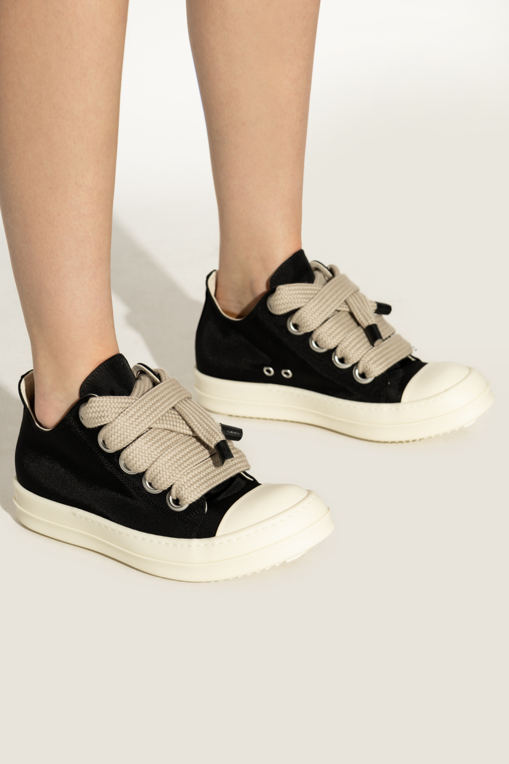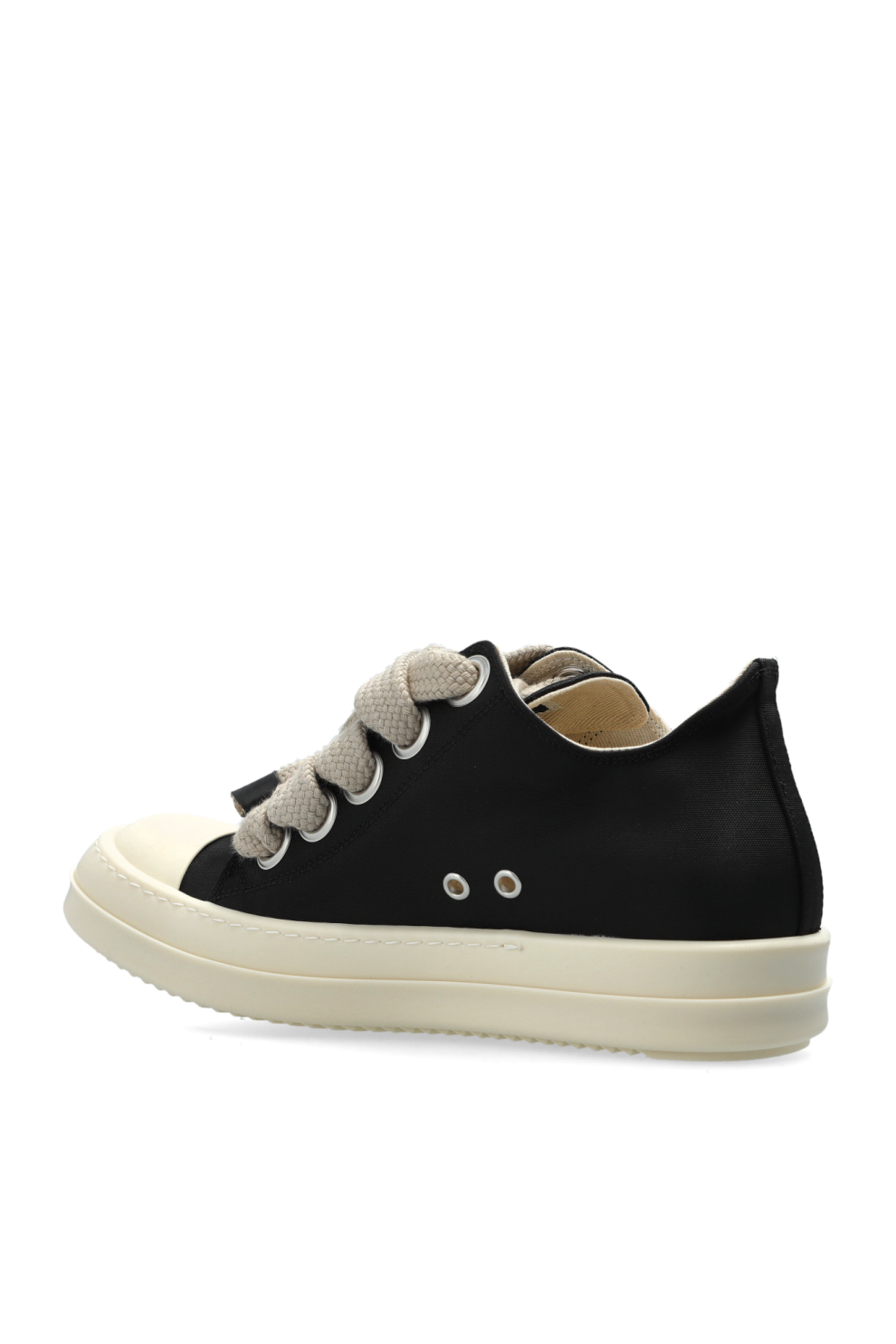 Кроссовки выглядят современно благодаря толстым, крупным шнуркам светлого оттенка, переплетённым с массивными металлическими люверсами, концы которых усилены прочным чёрным элементом. Внутренняя часть выполнена из мягкого парусина, обеспечивающего комфорт. Минималистичный дизайн дополняется двойными вентиляционными отверстиями, сохраняющими дух изысканной простоты.