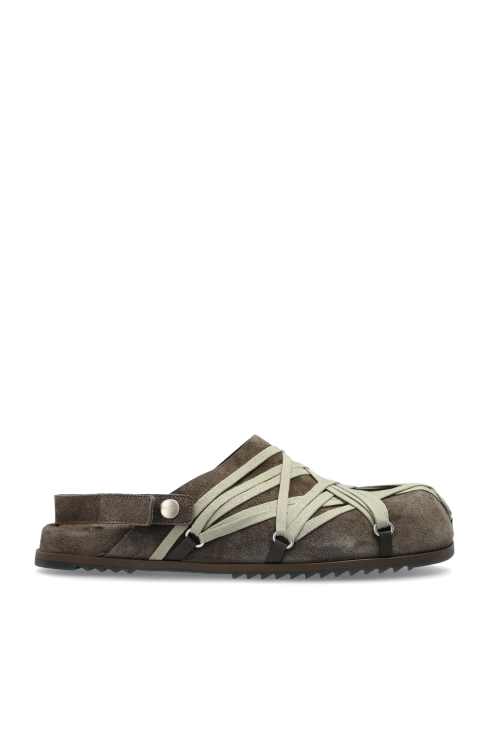Шлепанцы Granola — это баланс авангардной эстетики и продуманной функциональности Рика Оуэнса. Модель с закрытым носком и открытой пяткой дополнена широким фиксирующим ремешком с металлической кнопкой — графичная деталь подчеркивает характер и создает выразительный силуэт.