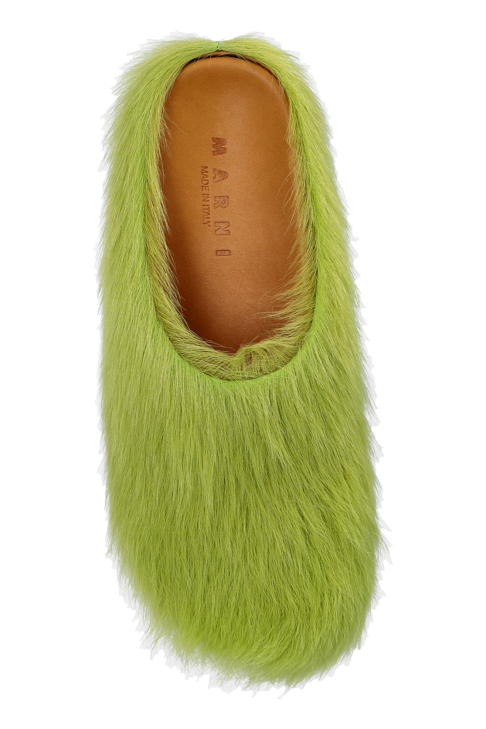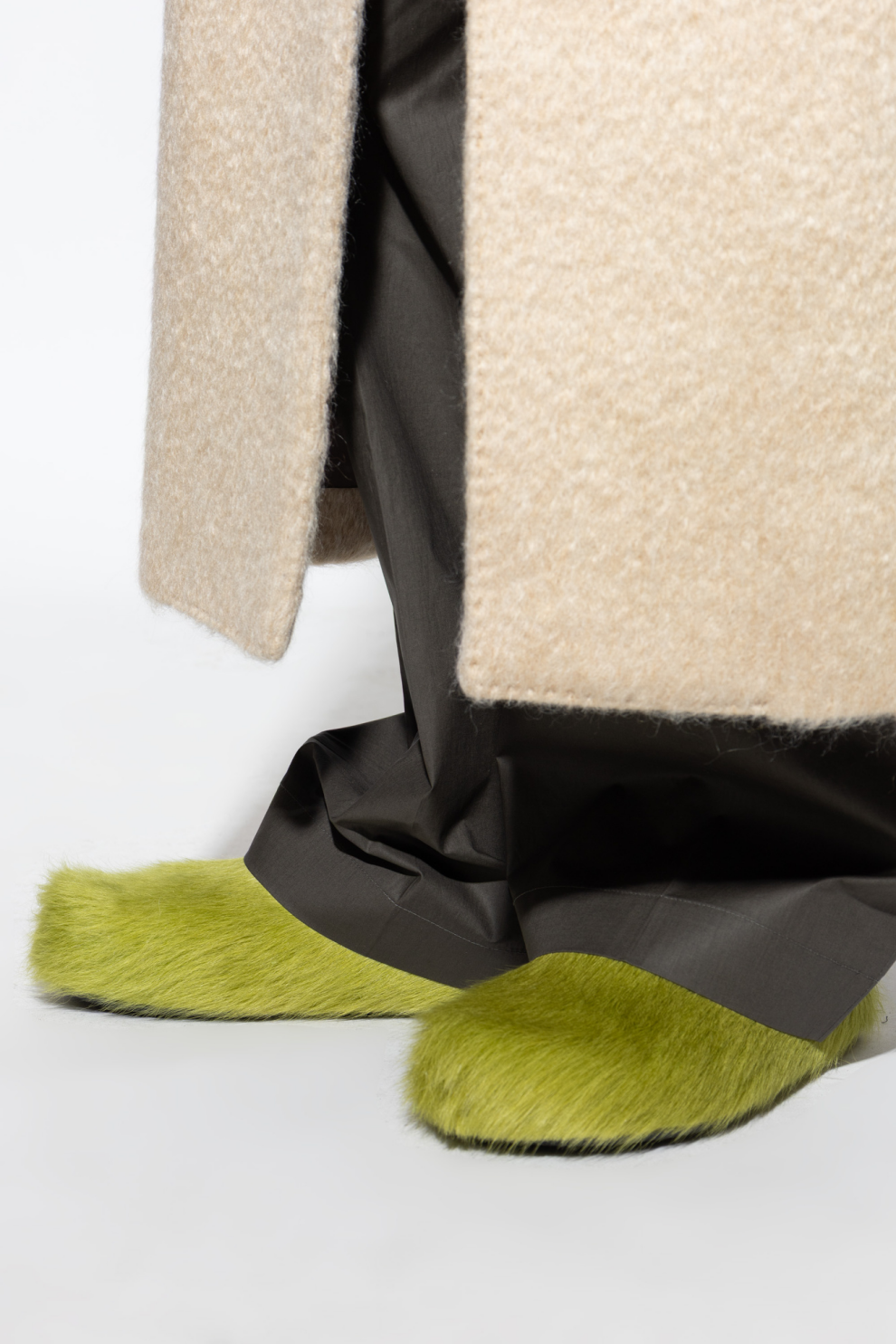 Закрытая конструкция с плавными линиями и приподнятым профилем окутывает стопу мягкостью и комфортом. Вся поверхность покрыта пышной телячьей шерстью насыщенного зелёного оттенка — выразительной, тактильно богатой и мгновенно узнаваемой. Внутренняя отделка из мягкой телячьей кожи дарит ощущение абсолютного уюта при каждом шаге.