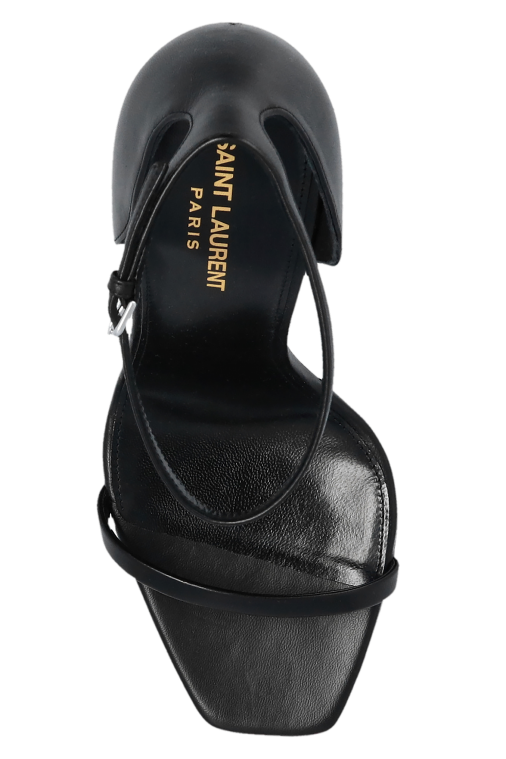 - Серебристый каблук в форме логотипа YSL — знак эксклюзивности.
