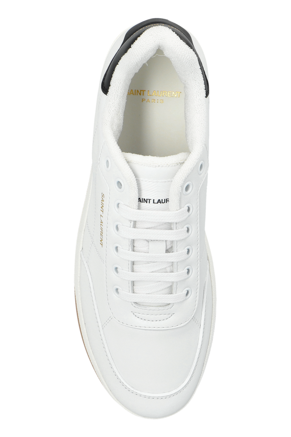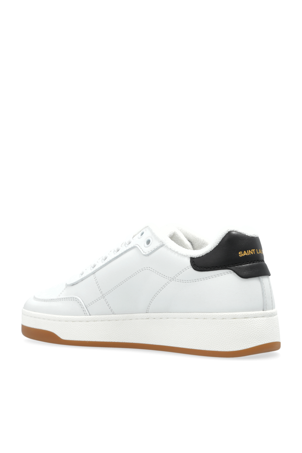 Основной белоснежный цвет подчеркнут тонкими чёрными акцентами и изящной золотистой надписью Saint Laurent на боку — деталью, придающей обуви характер узнаваемого люкса. Контрастная светло-коричневая подошва добавляет глубины силуэту и делает образ завершённым.