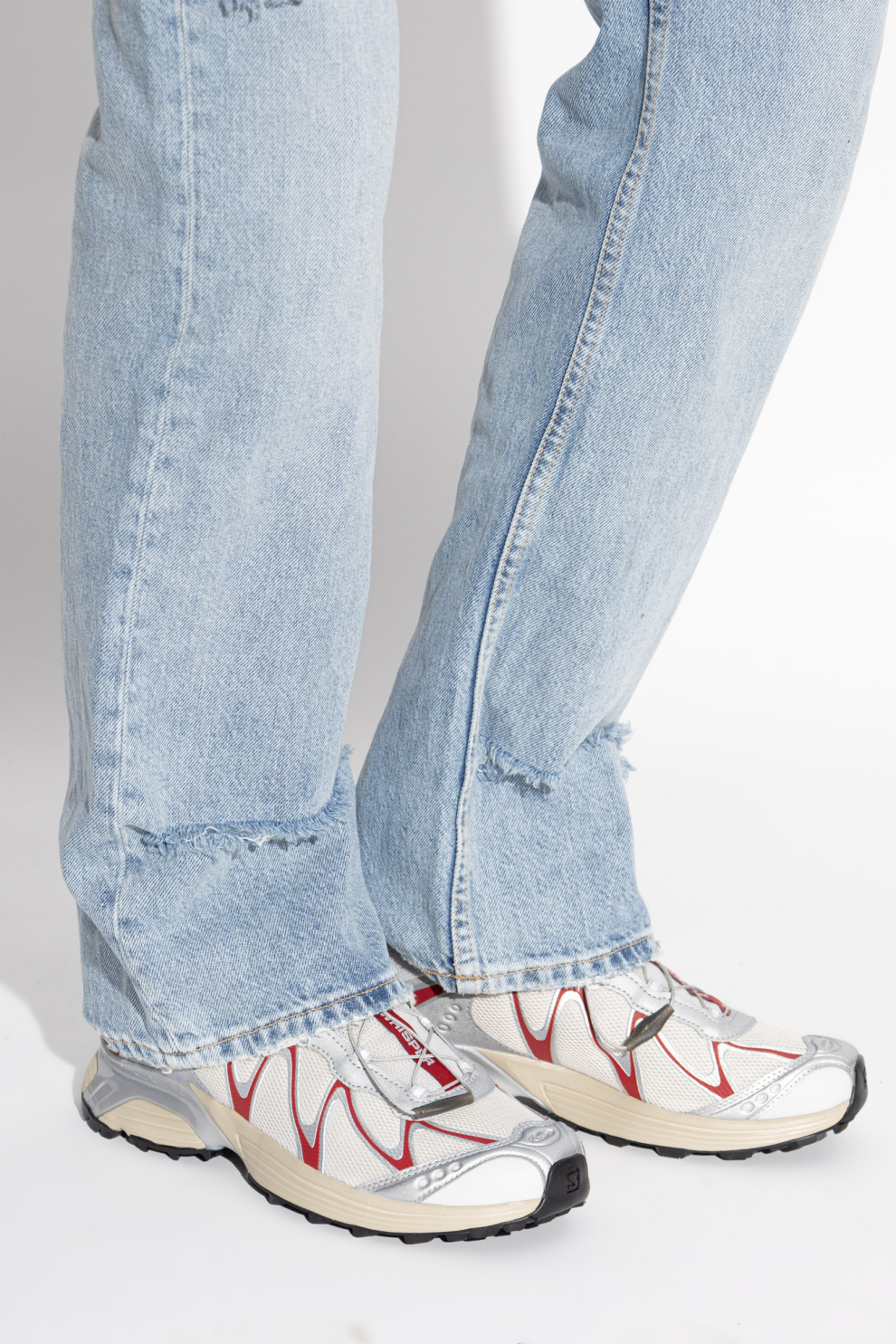 Кроссовки Salomon XT-WHISPER — современная интерпретация спортивного дизайна с акцентом на функциональность и визуальную динамику. Низкий силуэт подчёркнут контрастными линиями и выразительным красным акцентом по бокам верха, создающим узнаваемый и технологичный образ.