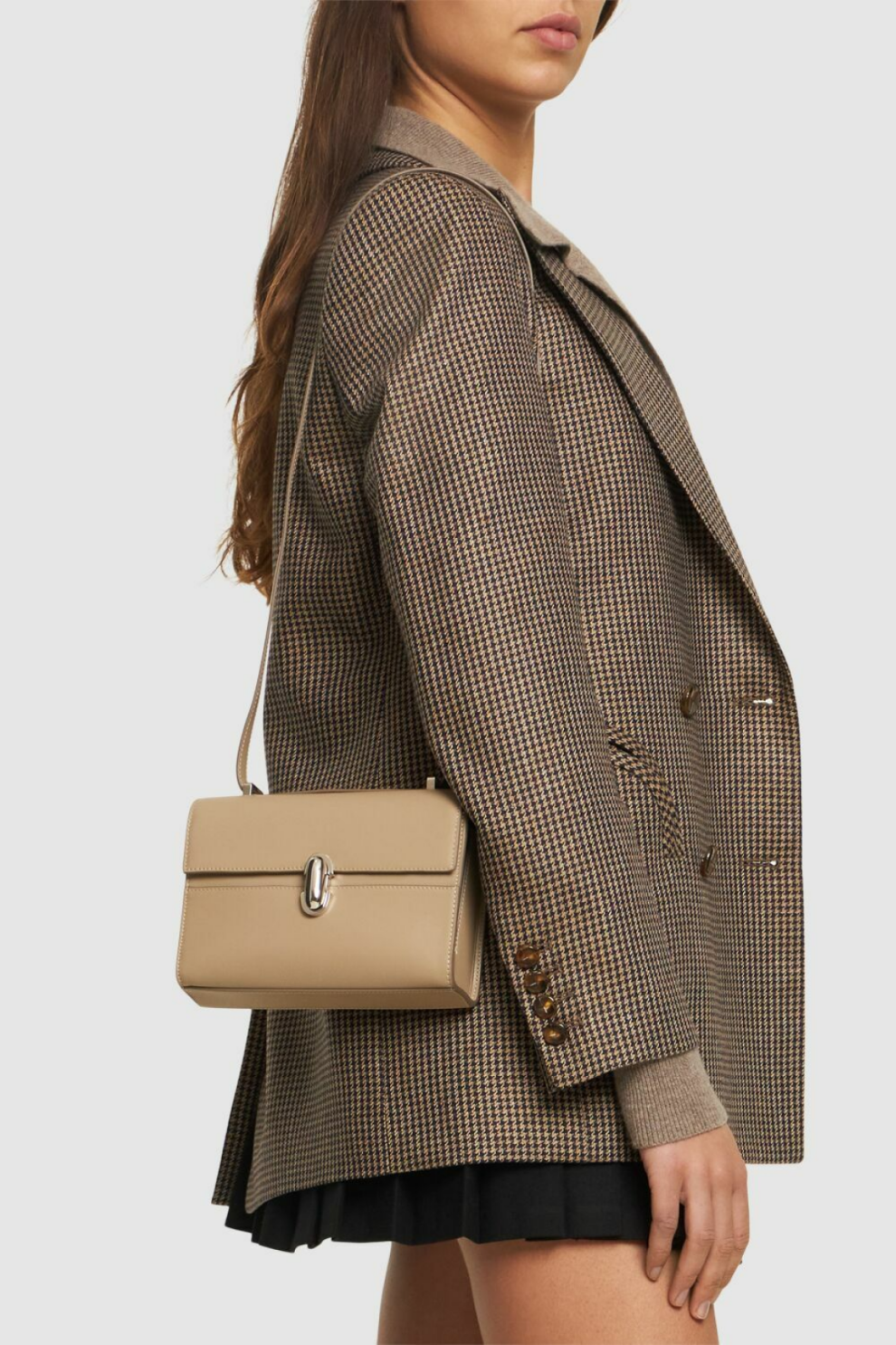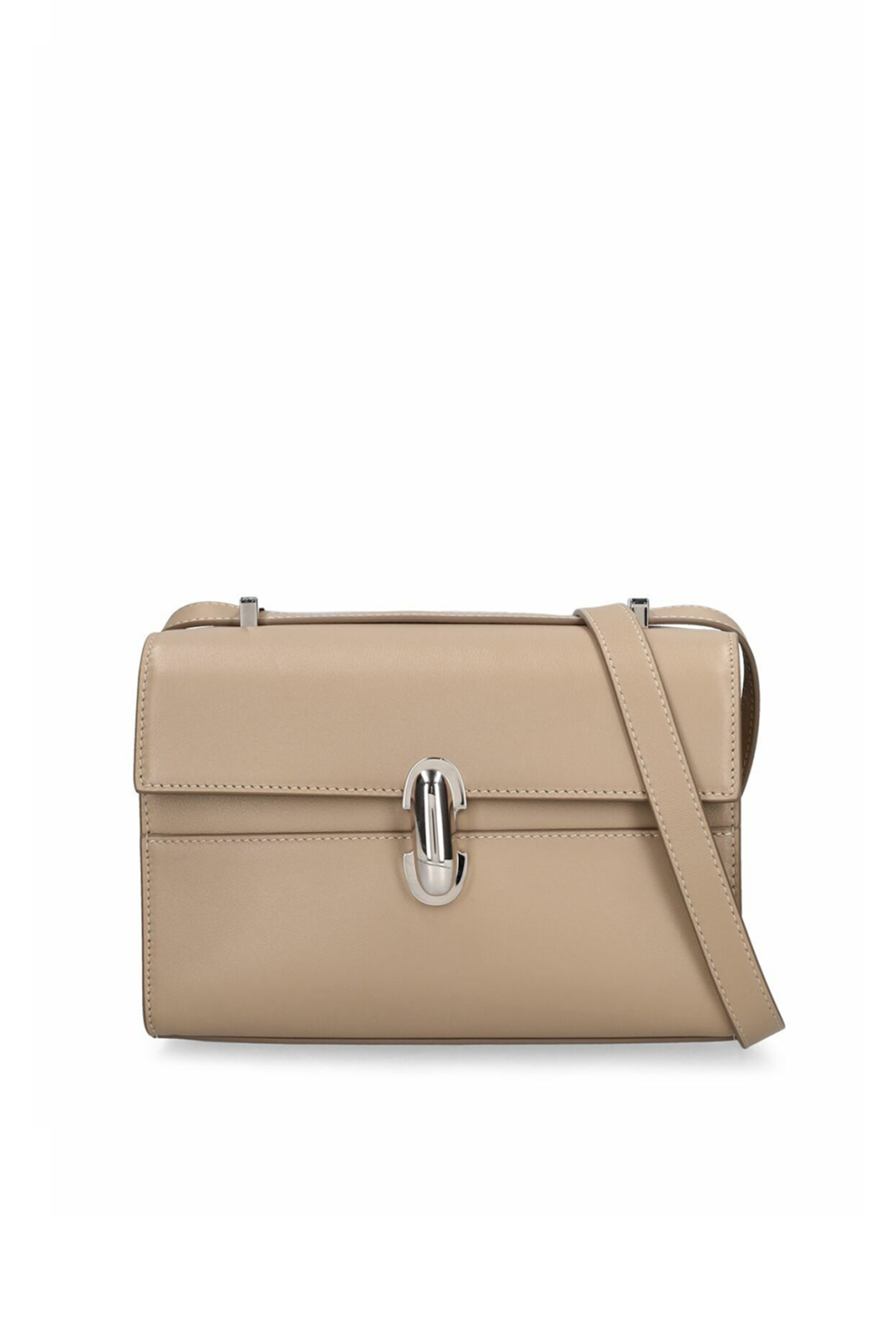 Эта модель оснащена фирменным поворотным замком на клапане, который подчёркивает скульптурность силуэта. Универсальный регулируемый ремень позволяет носить сумку как кросс-боди, так и на плече, а верхняя мини-ручка добавляет структурированности образу. Два внутренних кармана обеспечивают аккуратную организацию вещей, сохраняя компактность.