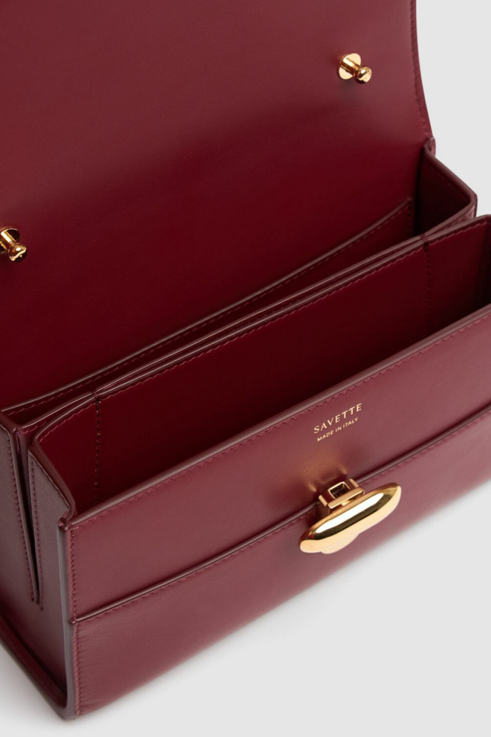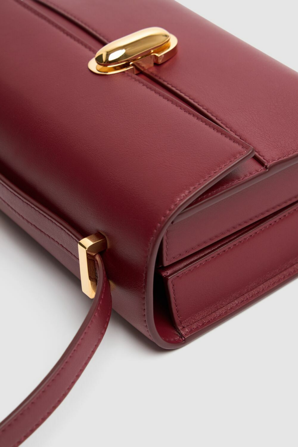 Внутри скрываются два функциональных кармана, а отделка из гладкой телячьей кожи формирует аккуратный и премиальный интерьер. Богатый винный оттенок делает сумку совершенным аксессуаром для образов в стиле «тихая роскошь», как дневных, так и вечерних.