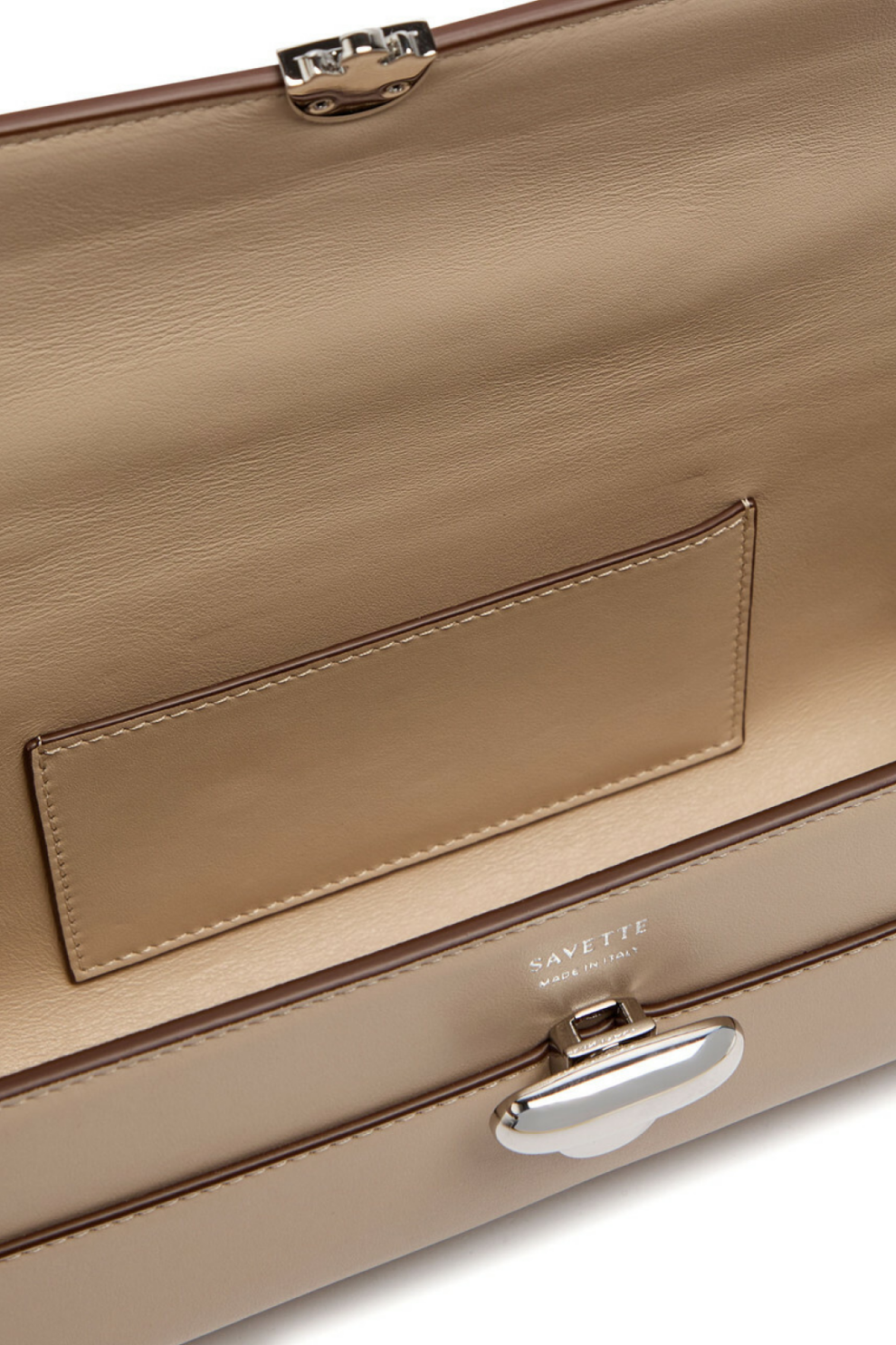 Классический клапан завершается культовой поворотной застёжкой Savette — сдержанной, изысканной и безупречно функциональной. Скрытый тиснёный логотип сохраняет чистоту дизайна, оставляя сумку идеальным примером «тихой роскоши».