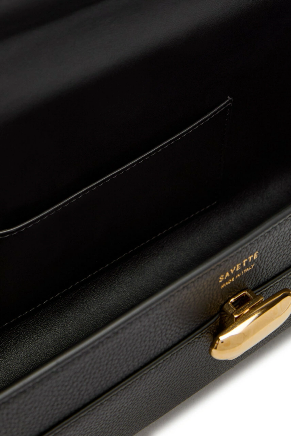 Фронтальный клапан завершается фирменной поворотной застёжкой Savette — элегантной и функциональной одновременно. Скрытое тиснение логотипа сохраняет лаконичность дизайна, а короткая верхняя ручка создаёт образ, вдохновлённый винтажной геометрией середины XX века.