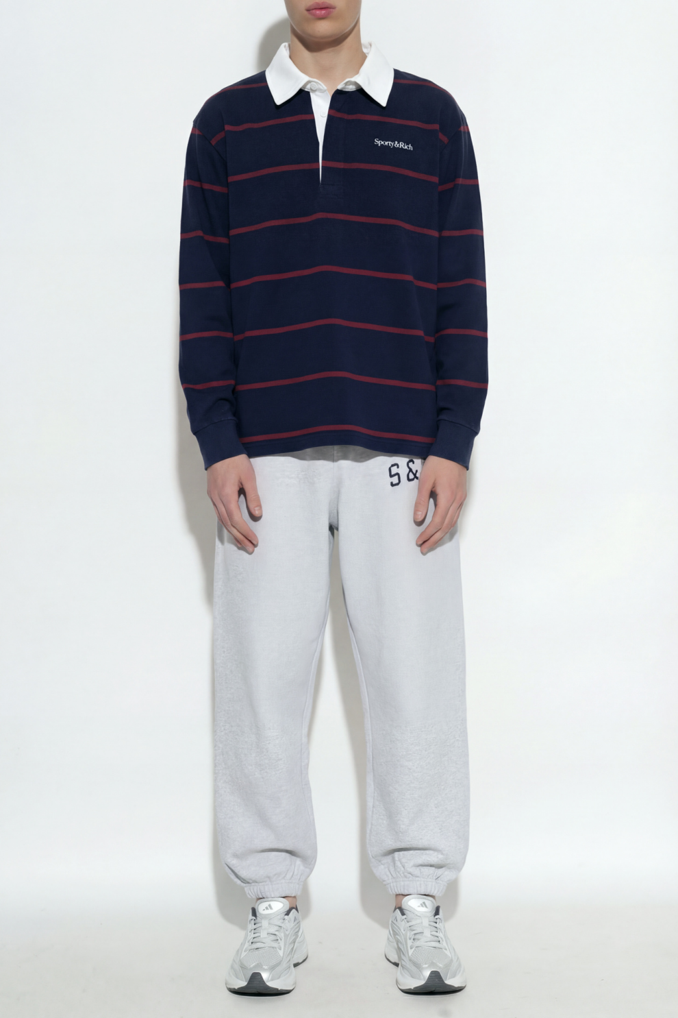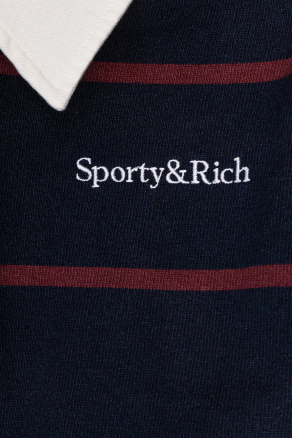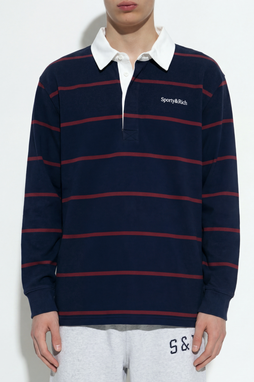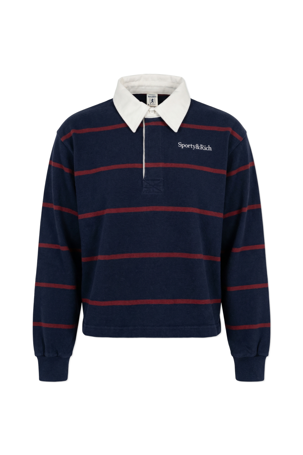 Эта рубашка-поло с длинными рукавами из коллекции «Central Park Drop» от Sporty & Rich очаровывает своей изысканной простотой и вневременным стилем. Мягкий, высококачественный хлопковый трикотаж глубокого темно-синего цвета украшен горизонтальными бордовыми полосами, подчеркивающими спортивную элегантность изделия. Смелый, контрастный белый воротник добавляет нотку элегантности, а незаметная открытая планка создает гармоничную общую композицию. Небольшая вышитая монограмма, отличительная черта коллекции, расположена на левой стороне груди.