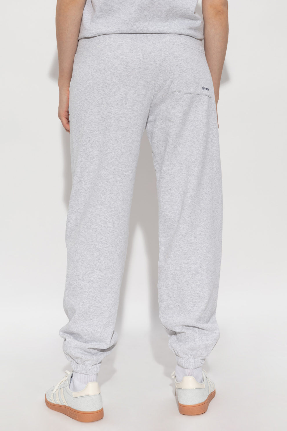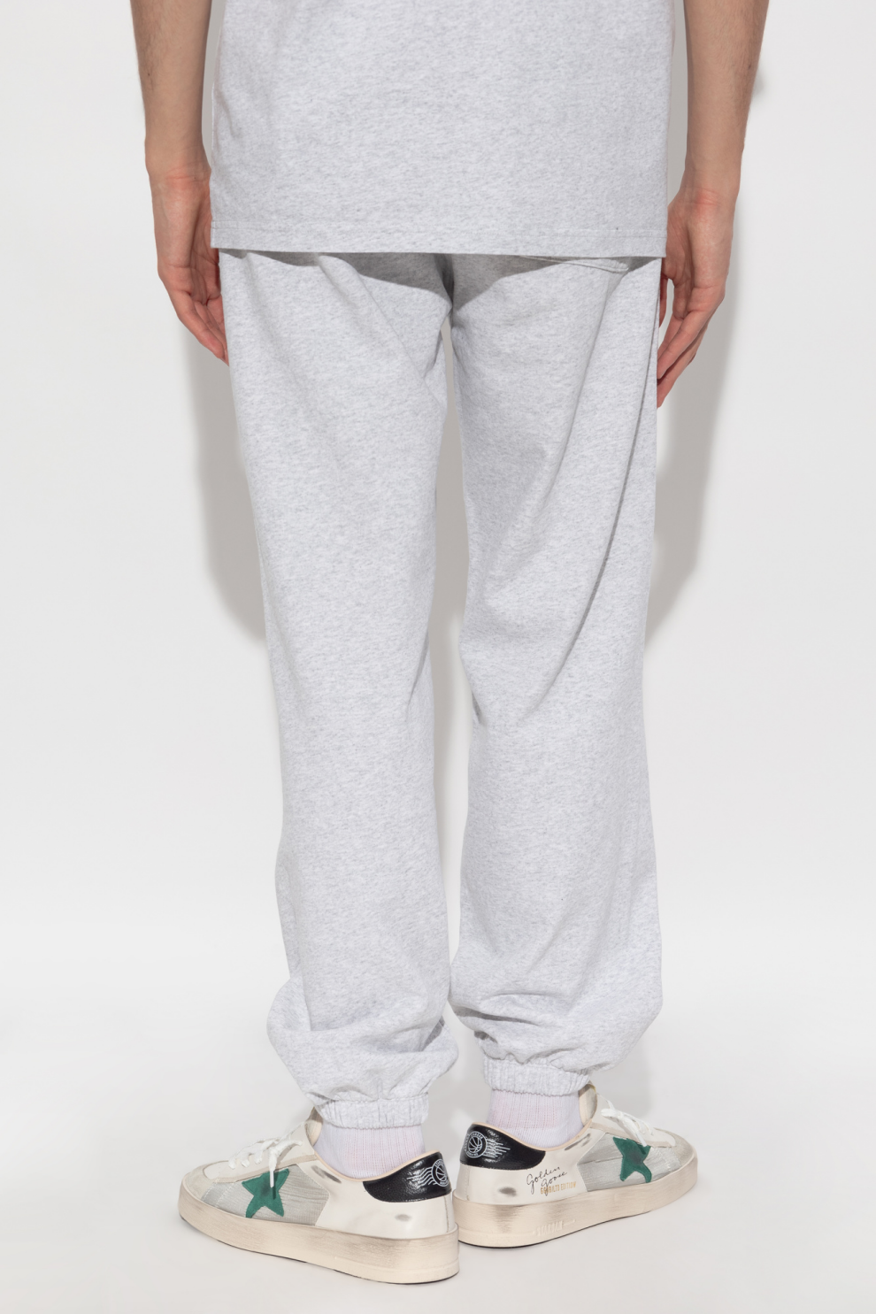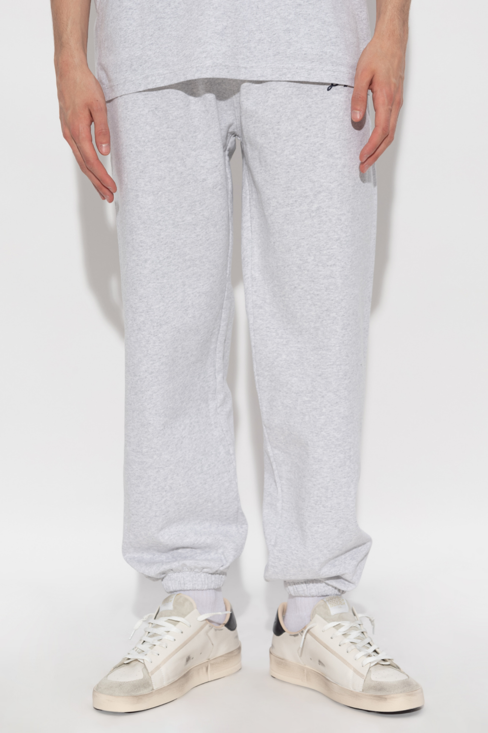 Серый оттенок материала подчеркивает их минималистичный характер, а эластичный пояс обеспечивает исключительный комфорт. Классические зауженные штанины с манжетами придают брюкам современный вид.