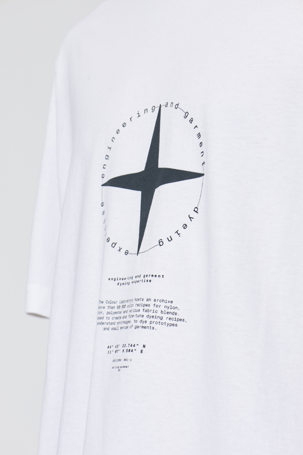Белый цвет подчеркивает чистоту и свежесть композиции, а круглый вырез и короткие рукава гарантируют комфорт в любой ситуации. Центральный выразительный принт – четырехконечная звезда, окруженная надписью – является узнаваемым символом и придает изделию неповторимый характер.