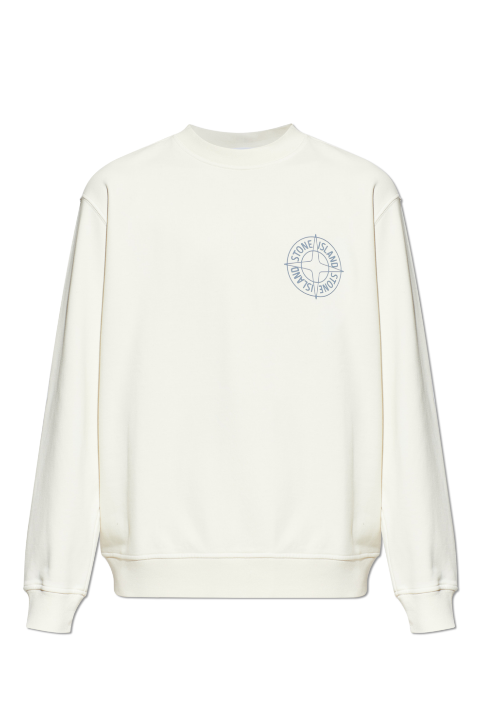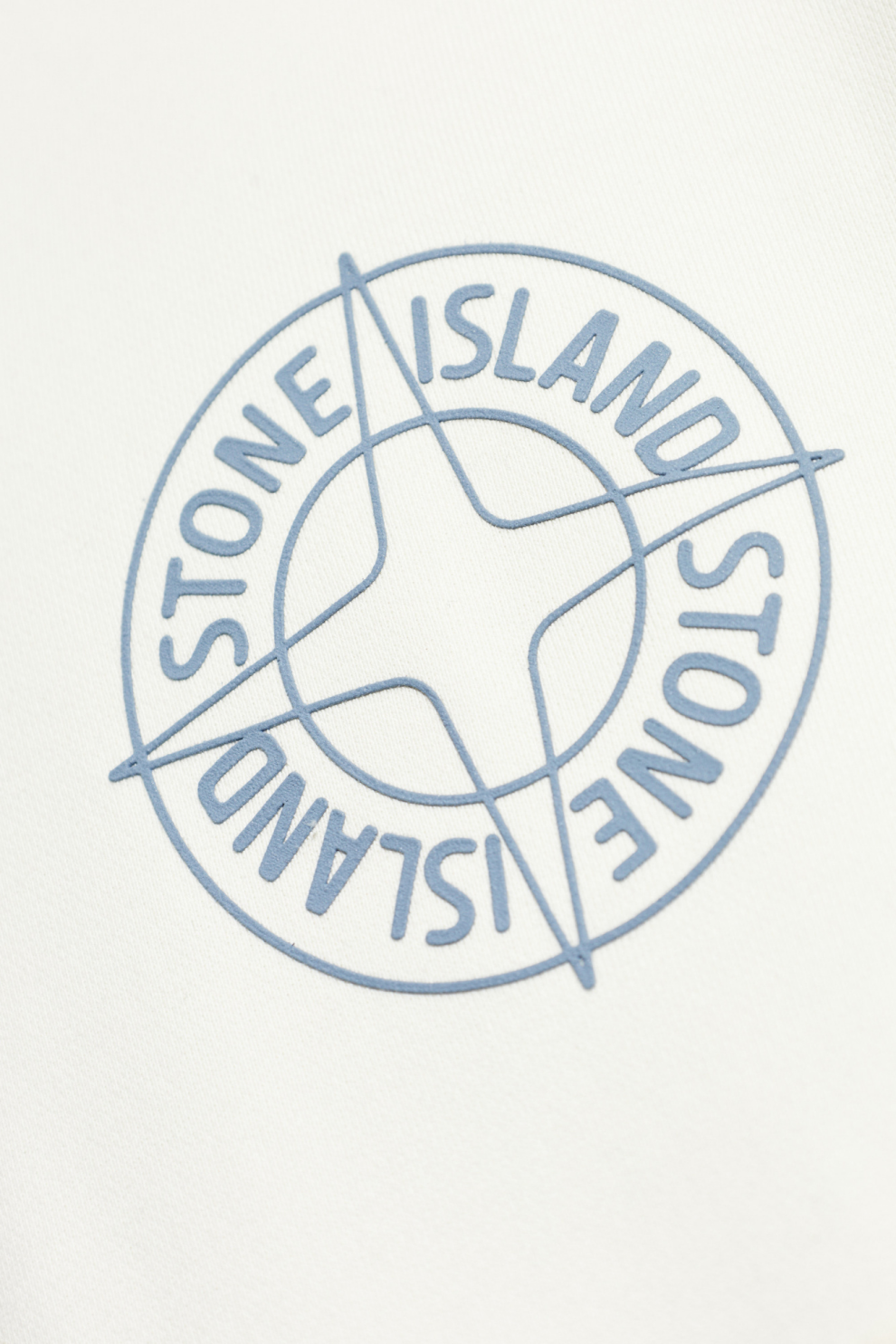 Классический крой с круглым вырезом подчеркивает универсальность дизайна, а широкие ребристые манжеты и нижний край добавляют структуру и визуальную завершенность силуэту. Контрастный светло-голубой круглый логотип с надписью «STONE ISLAND», размещенный спереди и эффектно повторенный на спине, становится выразительным, но сдержанным декоративным элементом.