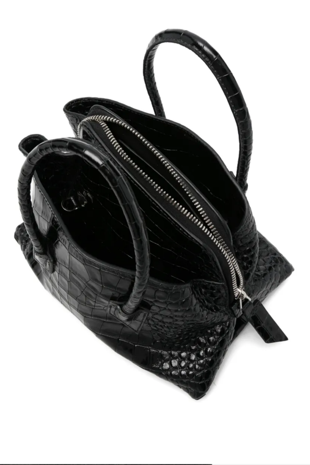 Выполненная из гладкой телячьей кожи с тиснением под крокодила в благородном черном цвете, сумка сочетает в себе элегантность и повседневную универсальность. Компактный формат гармонично дополнен верхней ручкой и съёмным ремешком, позволяя носить модель в руке или на плече.