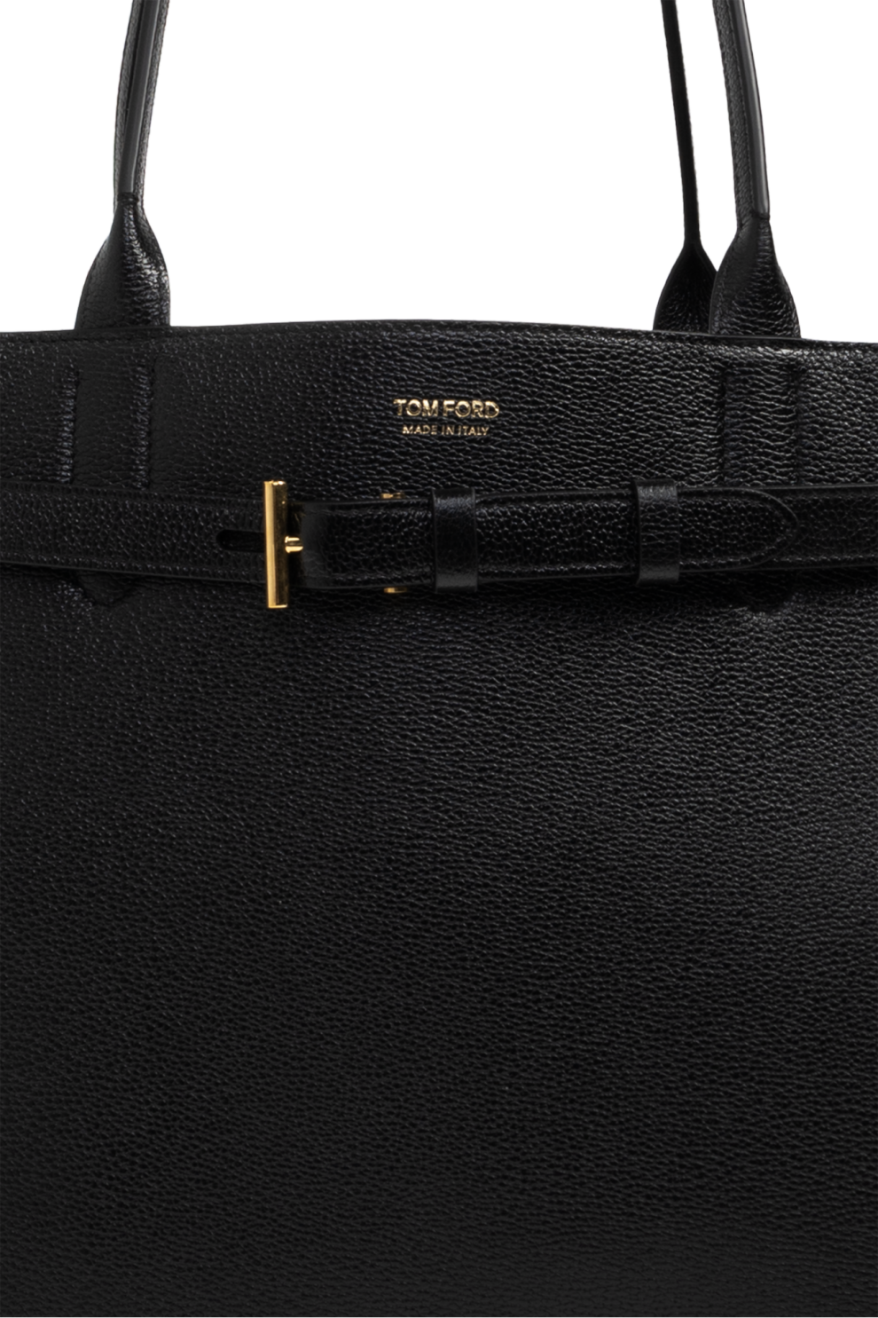 Привлекательной деталью является тонкий кожаный ремешок, продетый через переднюю часть и застегивающийся на декоративную золотую пряжку. Над ним расположен центральный логотип «TOM FORD», выполненный золотым тиснением, и надпись «MADE IN ITALY», подчеркивающие престиж изделия.