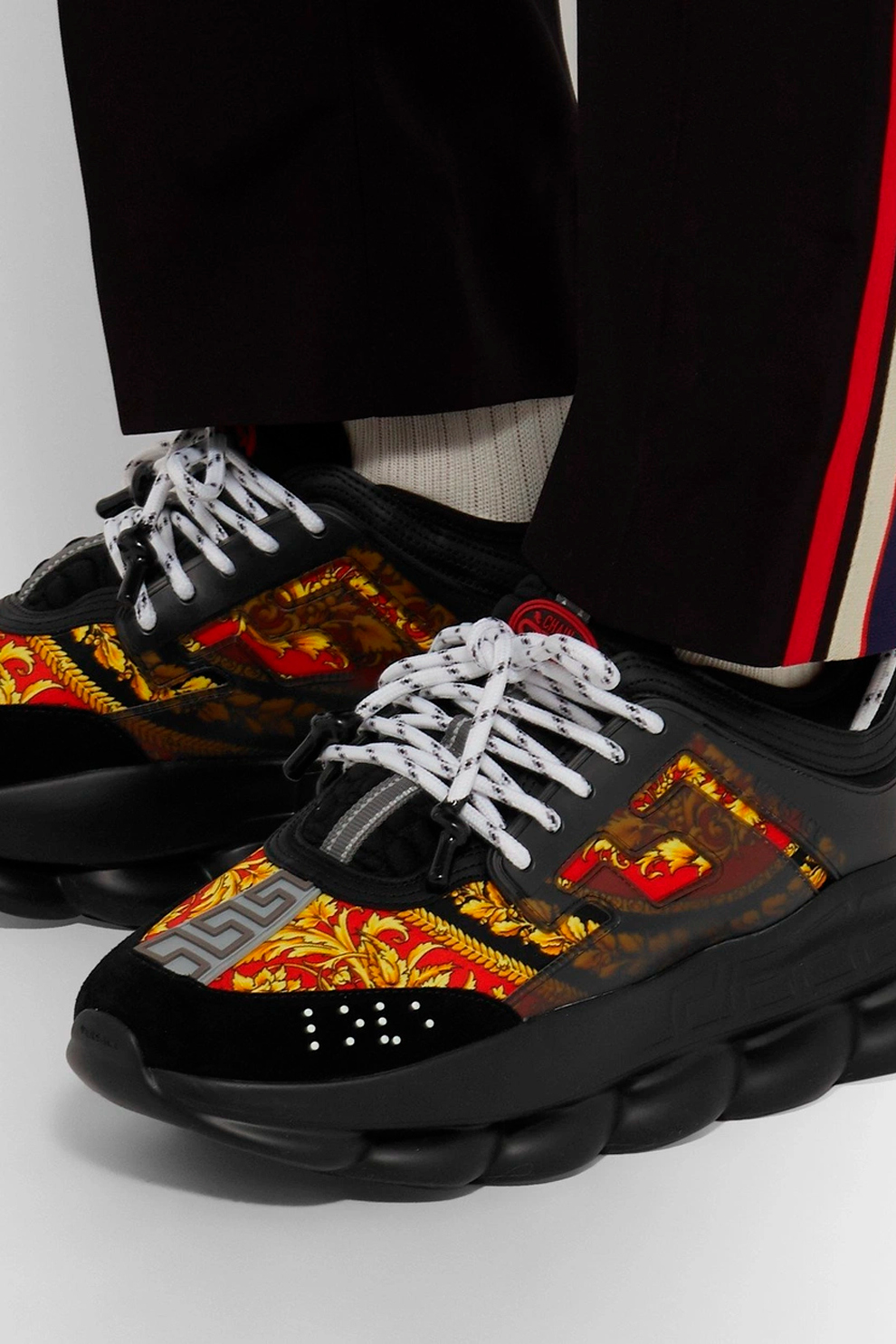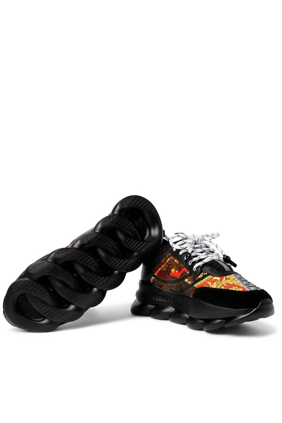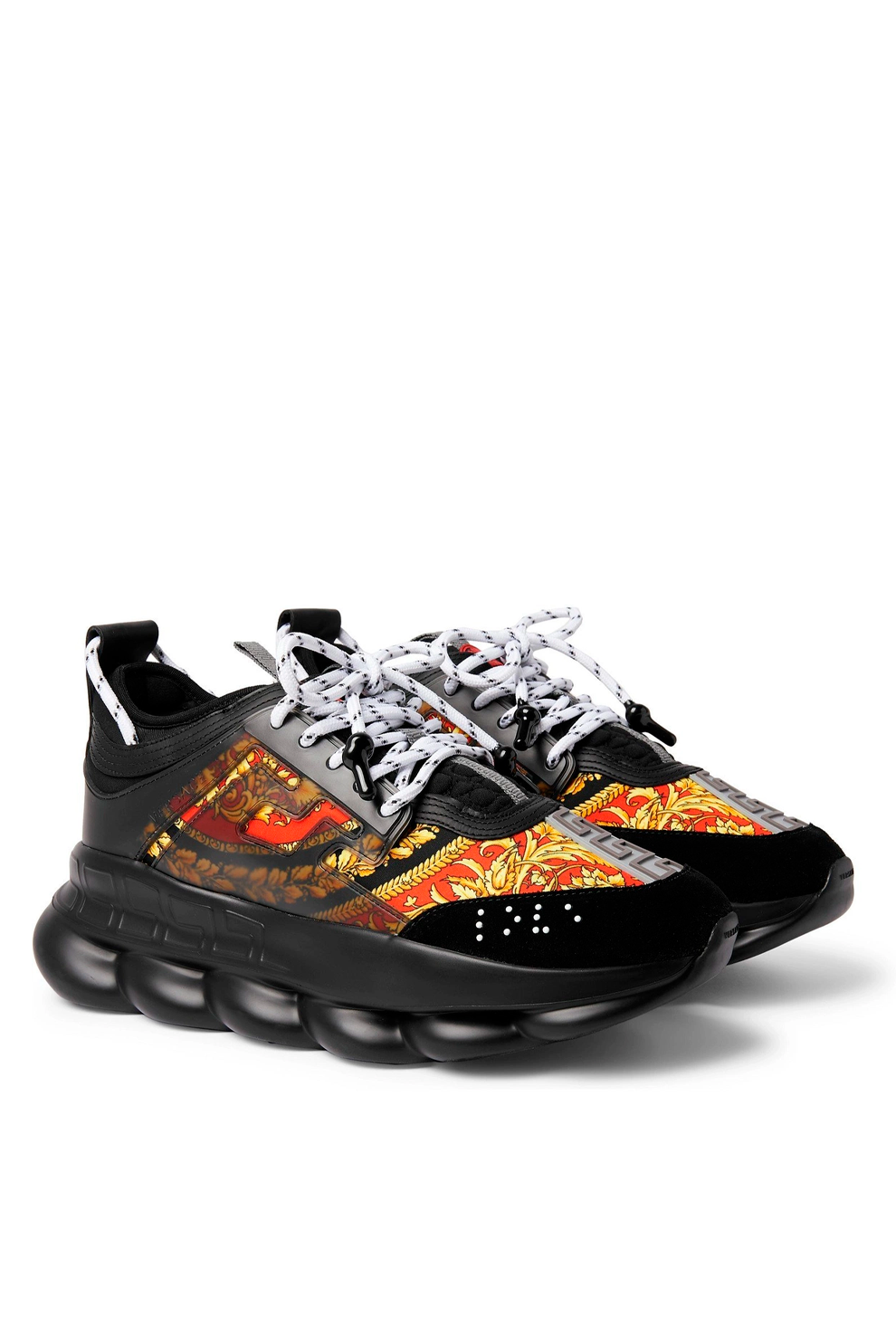 Комбинированные кроссовки Chain Reaction от Versace обязаны названием легкой скульптурной подошве, напоминающей звенья цепи.