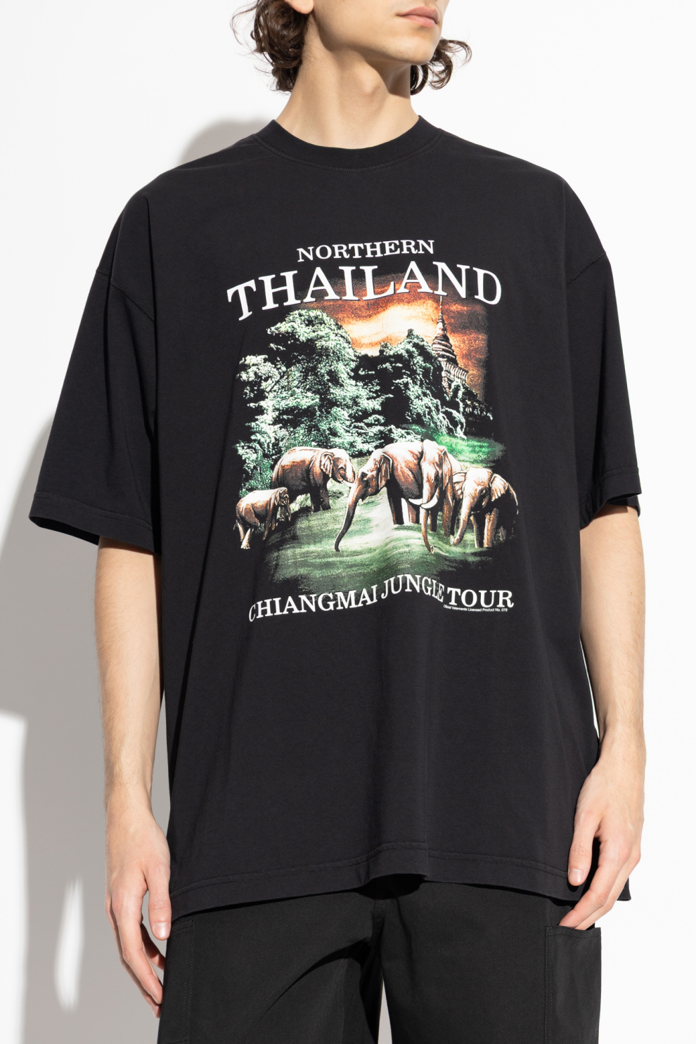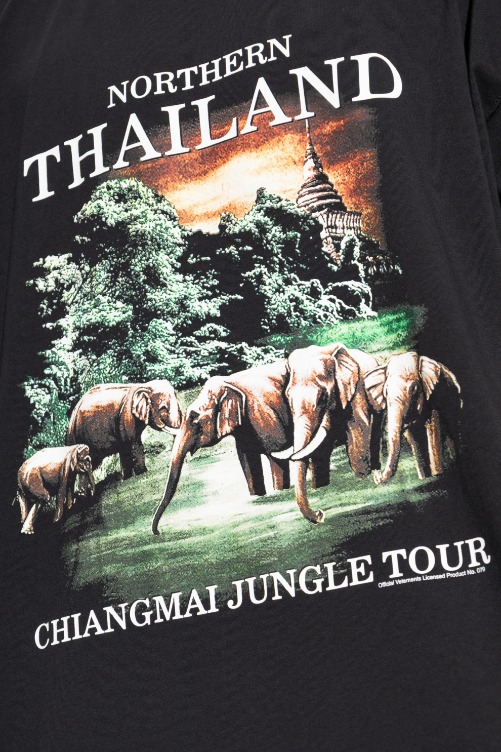 Изготовленная из премиального хлопка, футболка гарантирует комфорт и долговечность, оставаясь мягкой и приятной на ощупь. Центральный принт впечатляет детализированным изображением слонов среди тропической растительности на фоне характерного храма, вдохновленного джунглями северного Таиланда. Аккуратно интегрированные надписи «NORTHERN THAILAND» и «CHIANGMAI JUNGLE TOUR» подчеркивают эксклюзивность и художественный характер изделия, превращая повседневную вещь в настоящий объект внимания.