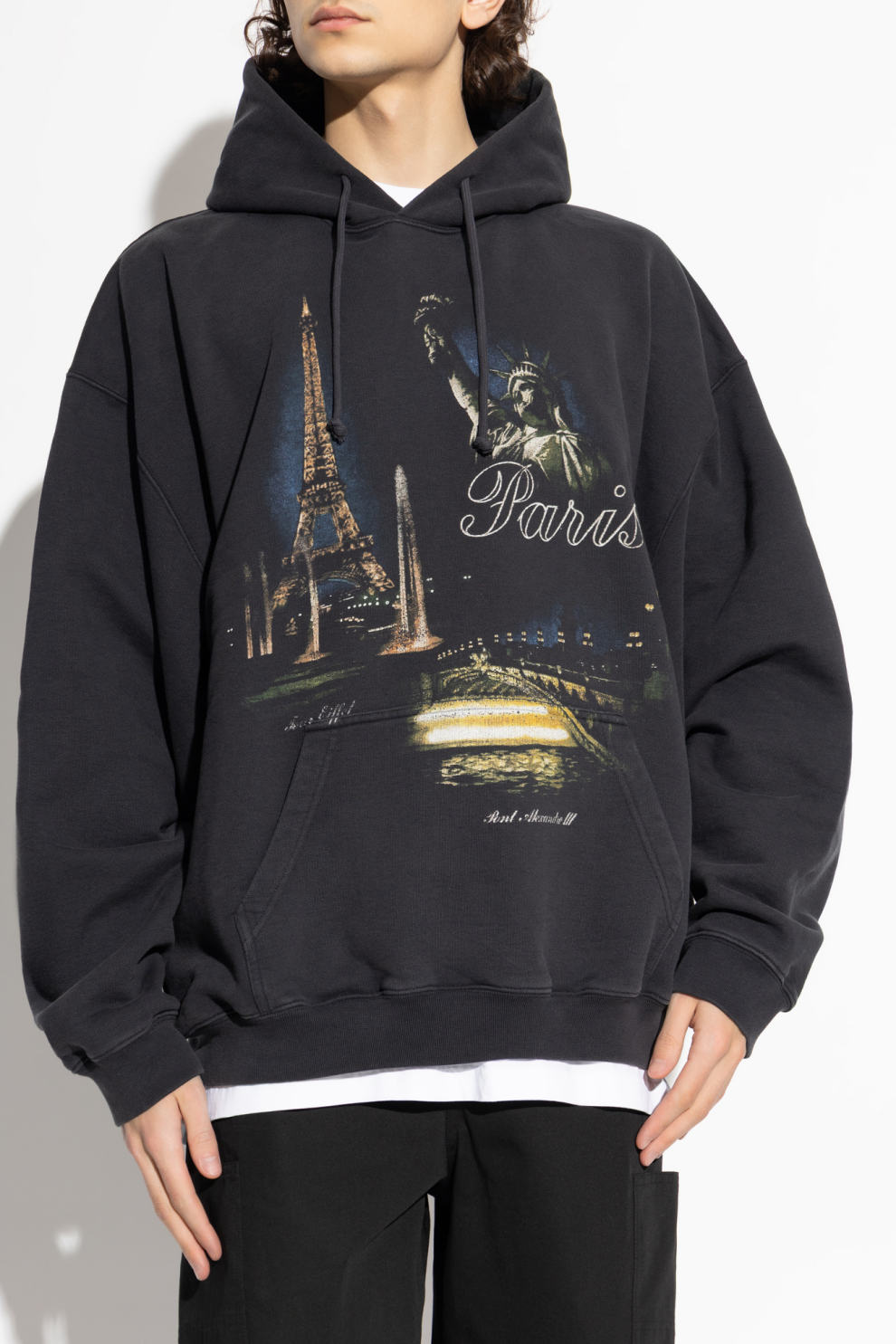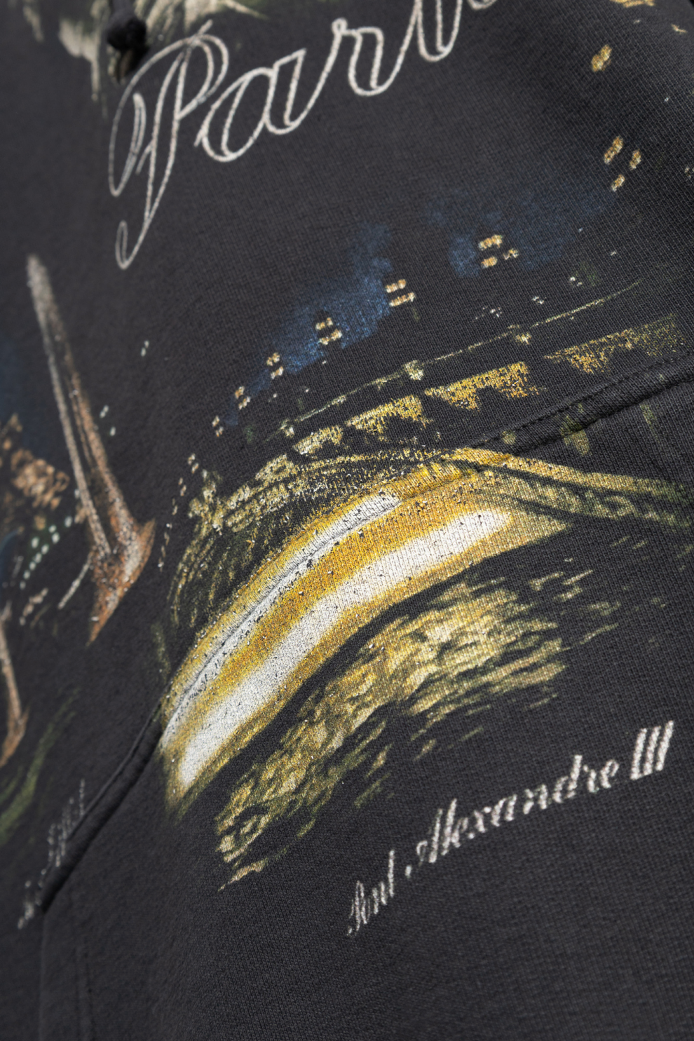 Свободный, просторный крой с широкими манжетами и классическим капюшоном обеспечивает комфорт и непринужденный силуэт, идеально подходящий для повседневного ношения. Центральный элемент — многоцветный принт ночного Парижа, с культовой Эйфелевой башней, мостом Александра III и декоративной надписью «Paris», которая добавляет художественный, модный акцент.