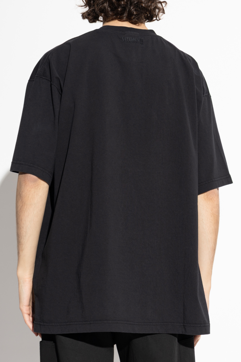 Эта черная футболка с принтом от Vetements сочетает вневременную элегантность и современный урбанистический стиль. Свободный, слегка объемный крой, короткие слегка расклешенные рукава и аккуратный круглый ребристый вырез создают непринужденный силуэт, в котором комфорт гармонично сочетается с выразительным дизайном.