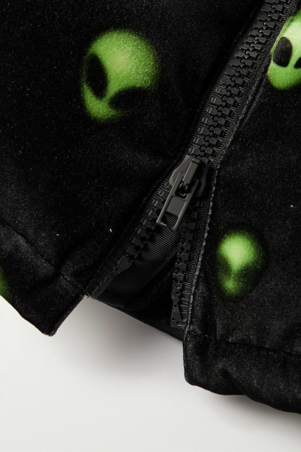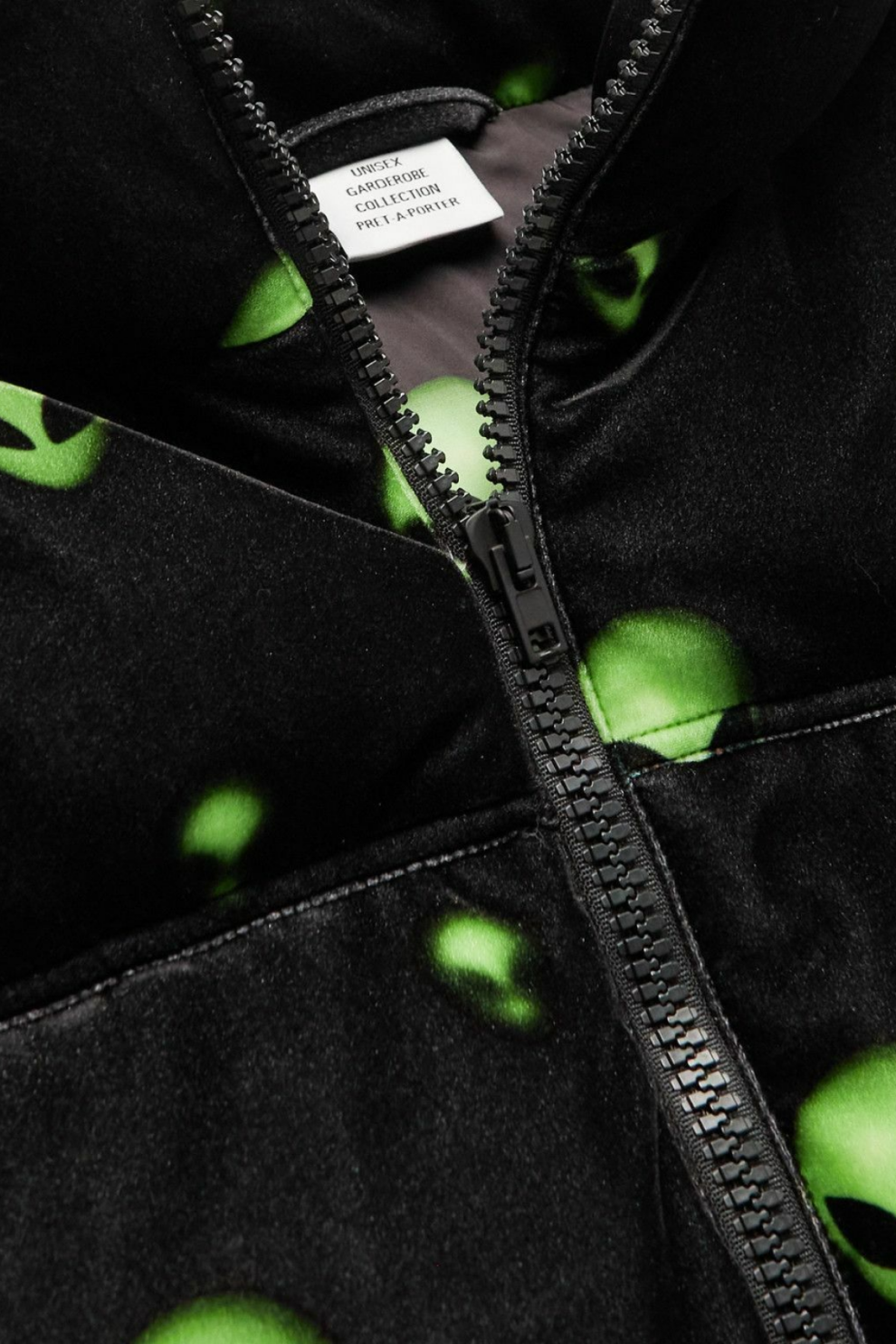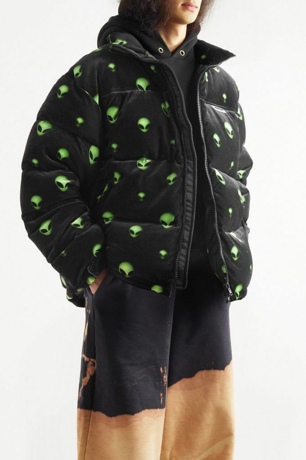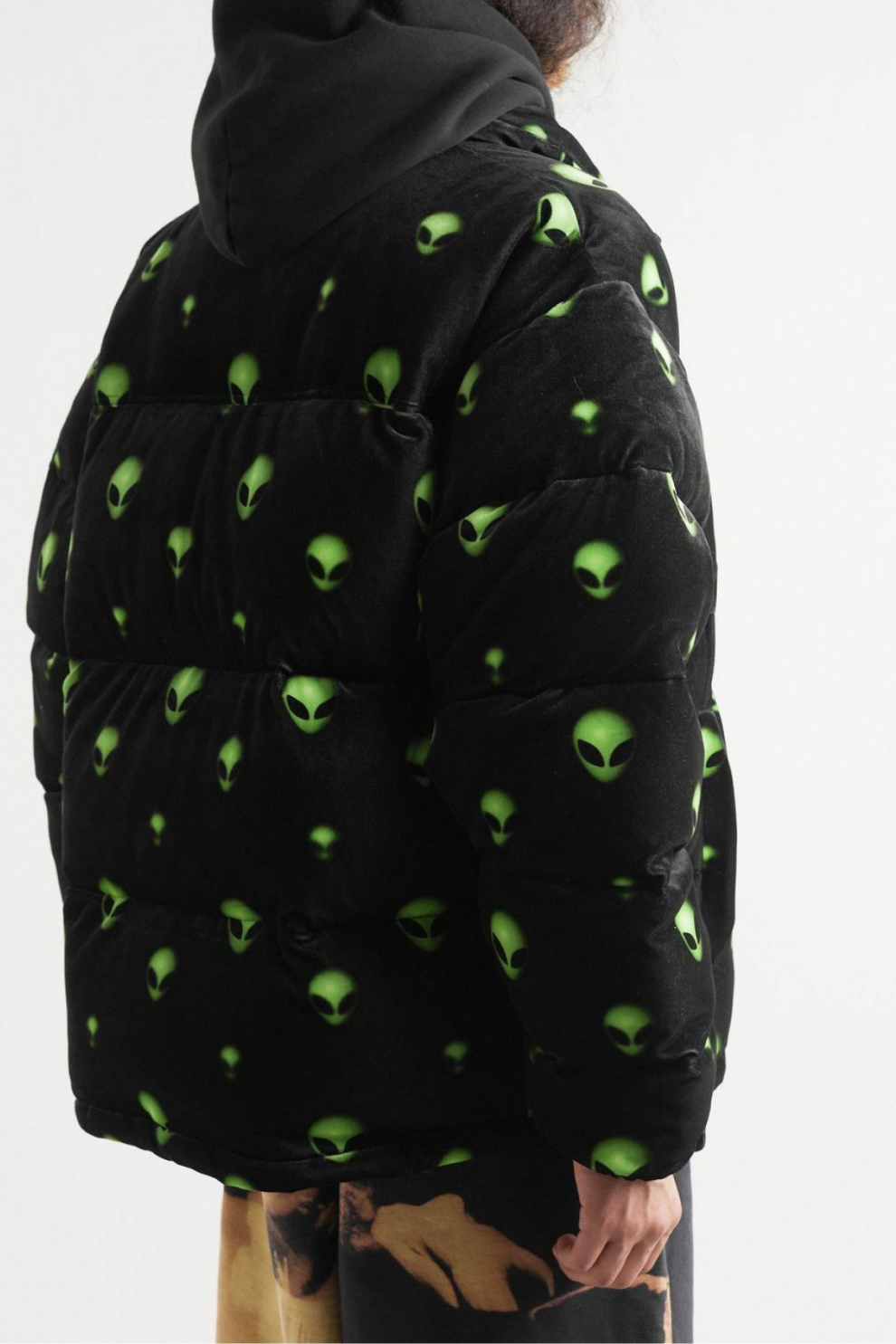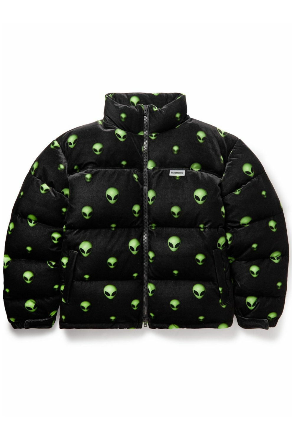 Пуховик Vetements Extraterrestrial — дерзкое воплощение футуристической эстетики бренда, вдохновлённое образами научной фантастики и уличной культурой. Изготовленный из мягкого бархатистого нейлона с добавлением эластана, он впечатляет глубокой чёрной фактурой и эффектным зелёным принтом в виде инопланетных символов, ставшим узнаваемым акцентом коллекции.