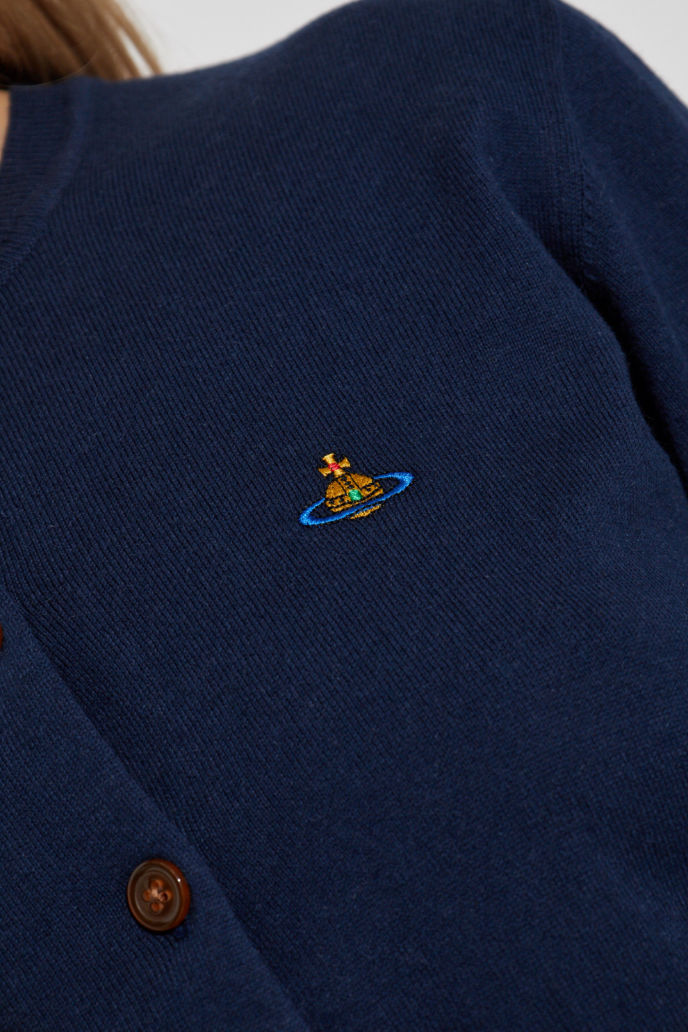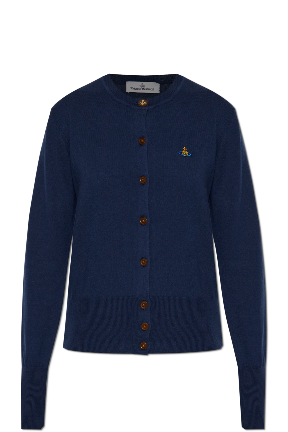 Гладкая вязка с аккуратными ребристыми манжетами создаёт идеально сбалансированный силуэт, а вышитый вручную логотип в золотисто-синих тонах на груди добавляет тонкий акцент благородства и аутентичности. Этот кардиган идеально вписывается в концепцию утончённого стиля Vivienne Westwood — сдержанного, уверенного и при этом глубоко индивидуального.