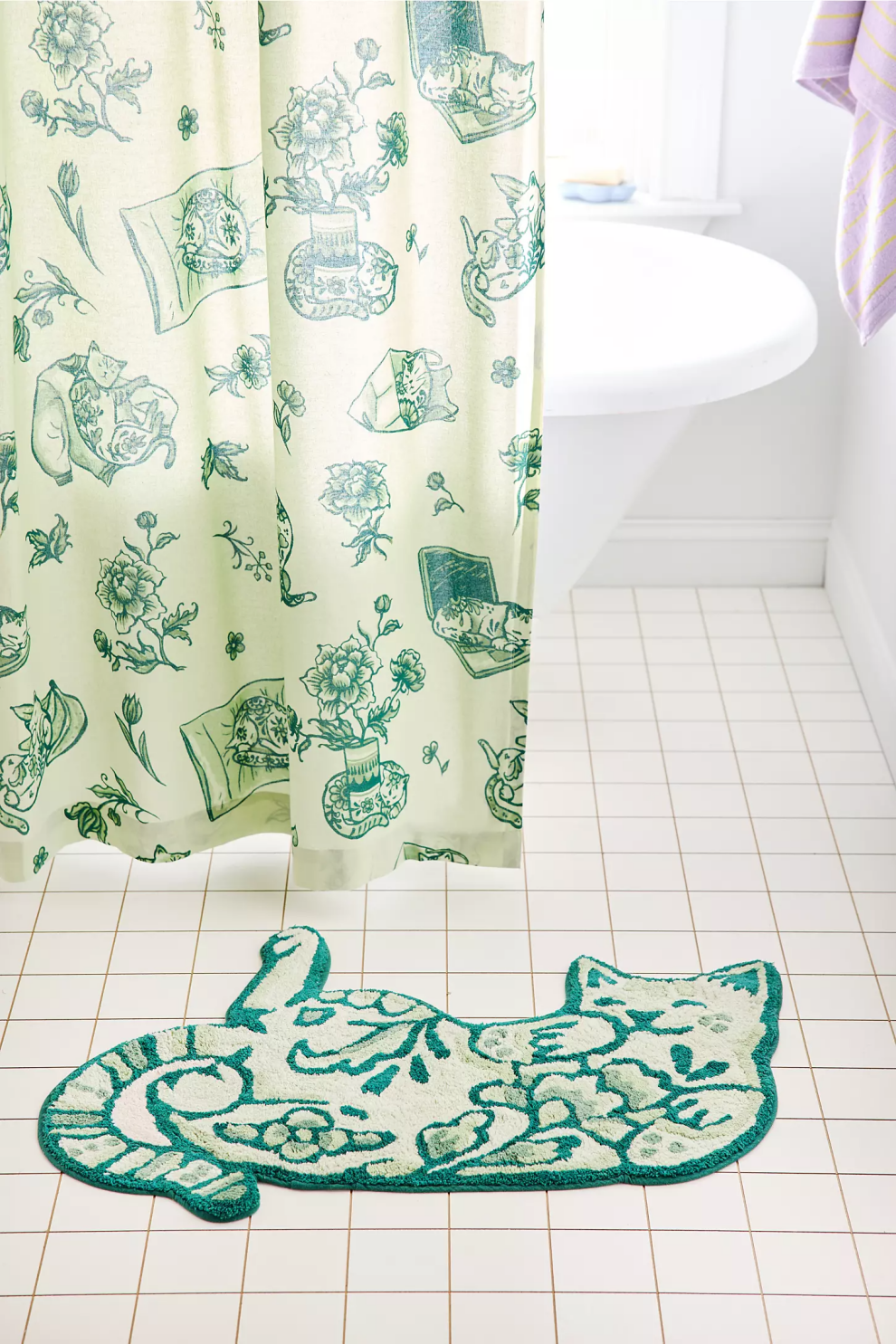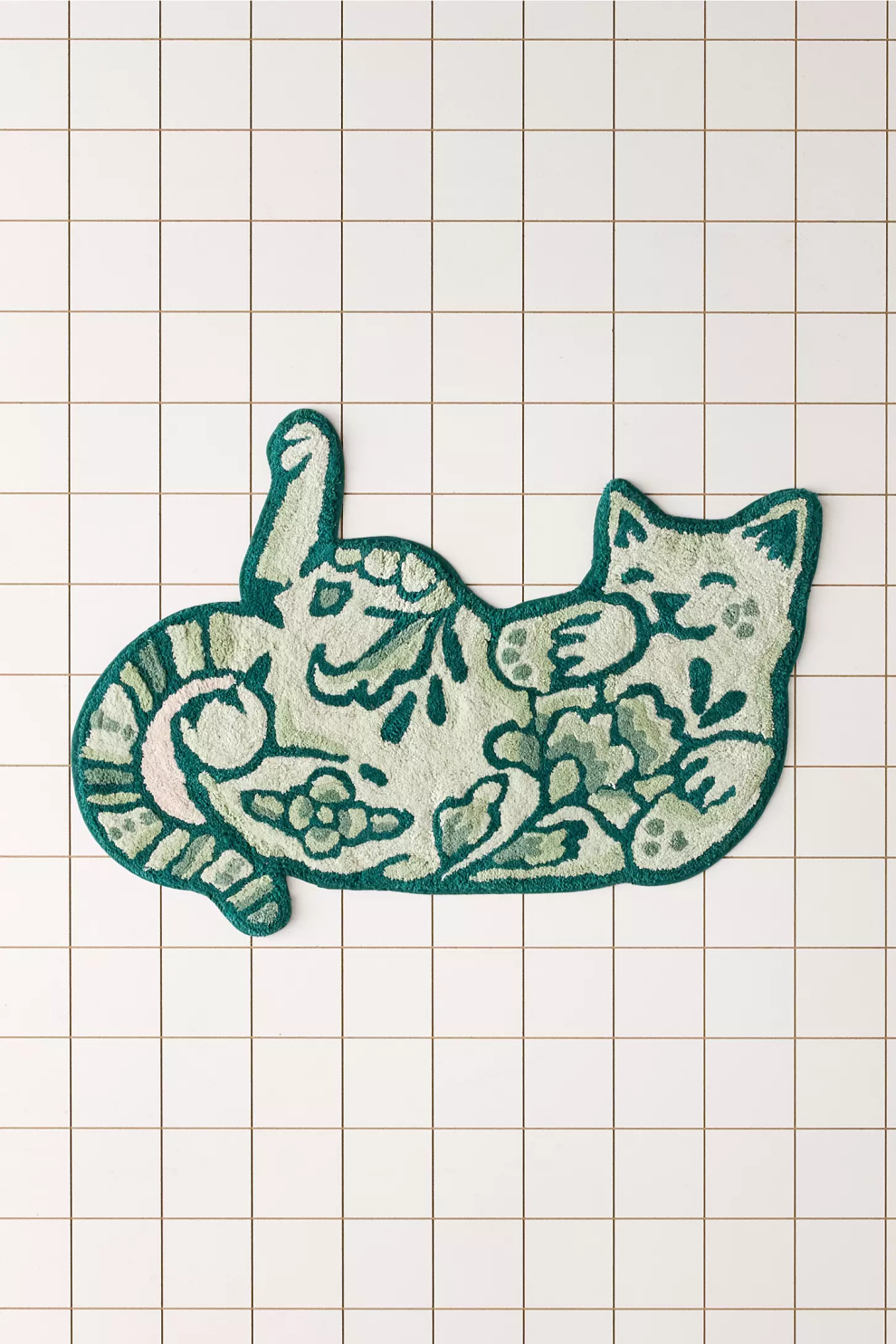 Зелёный тафтинговый декоративный коврик для ванной в форме кота Whiskers от Орбита Home – уютный арт-объект для стильного интерьера